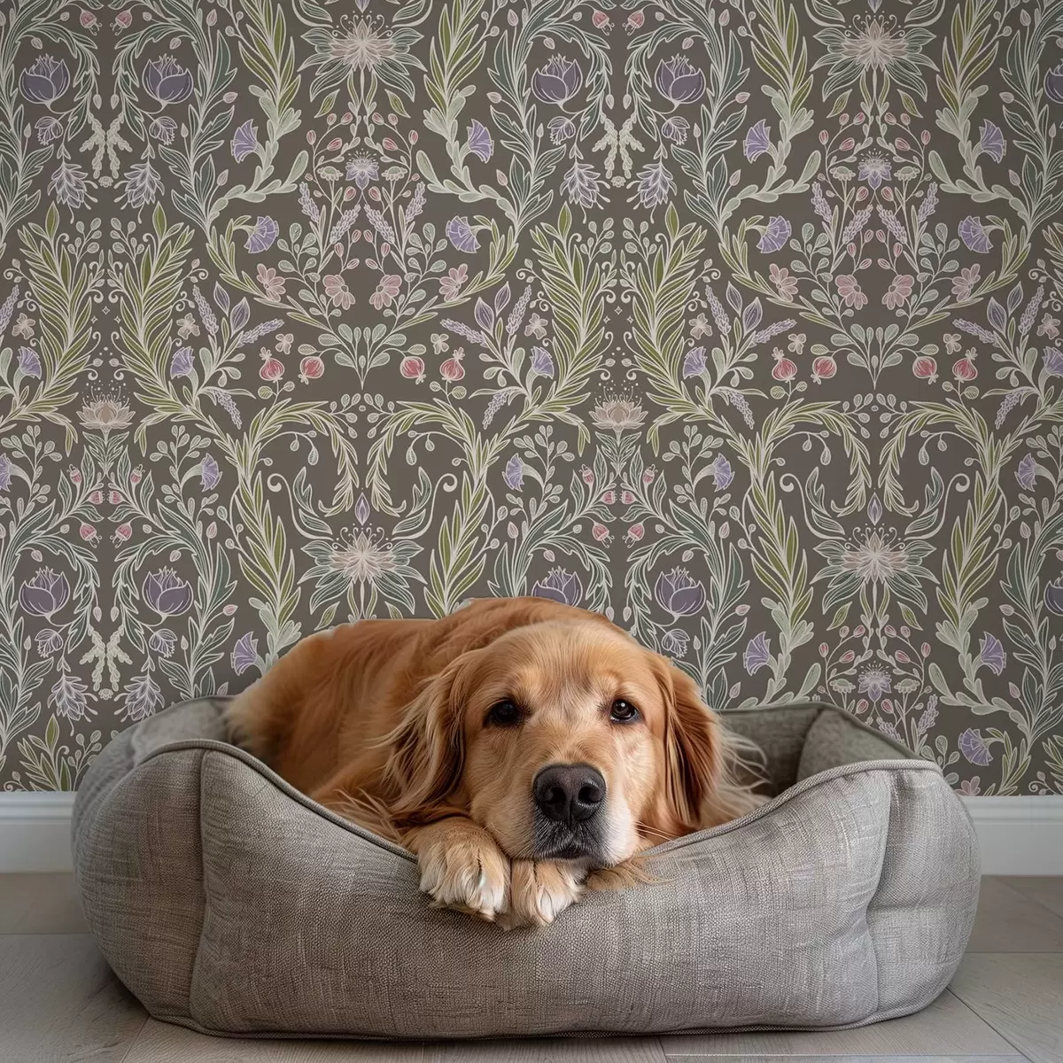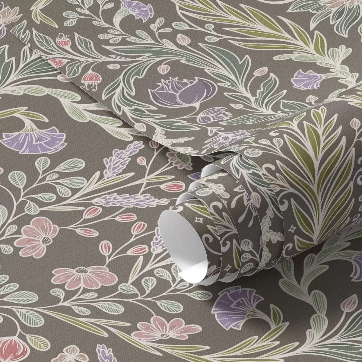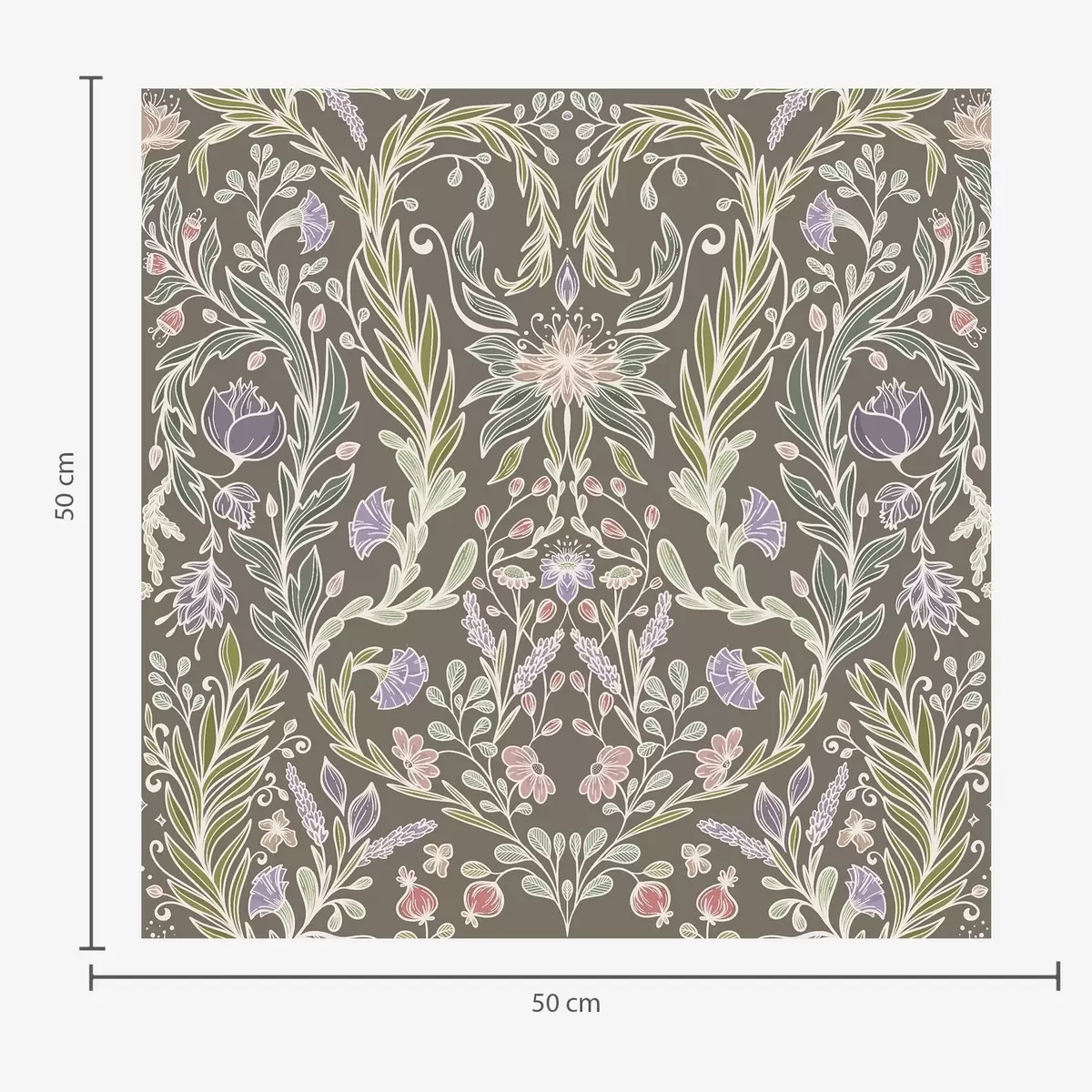 Behang Symmetrische bloemen en bladeren op een bruingrijze achtergrond Nr. a00928v2