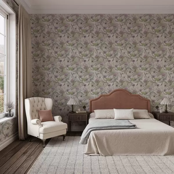 Behang Lila wilde bloemen en bladeren op een poederachtige achtergrond Nr. a00930v3