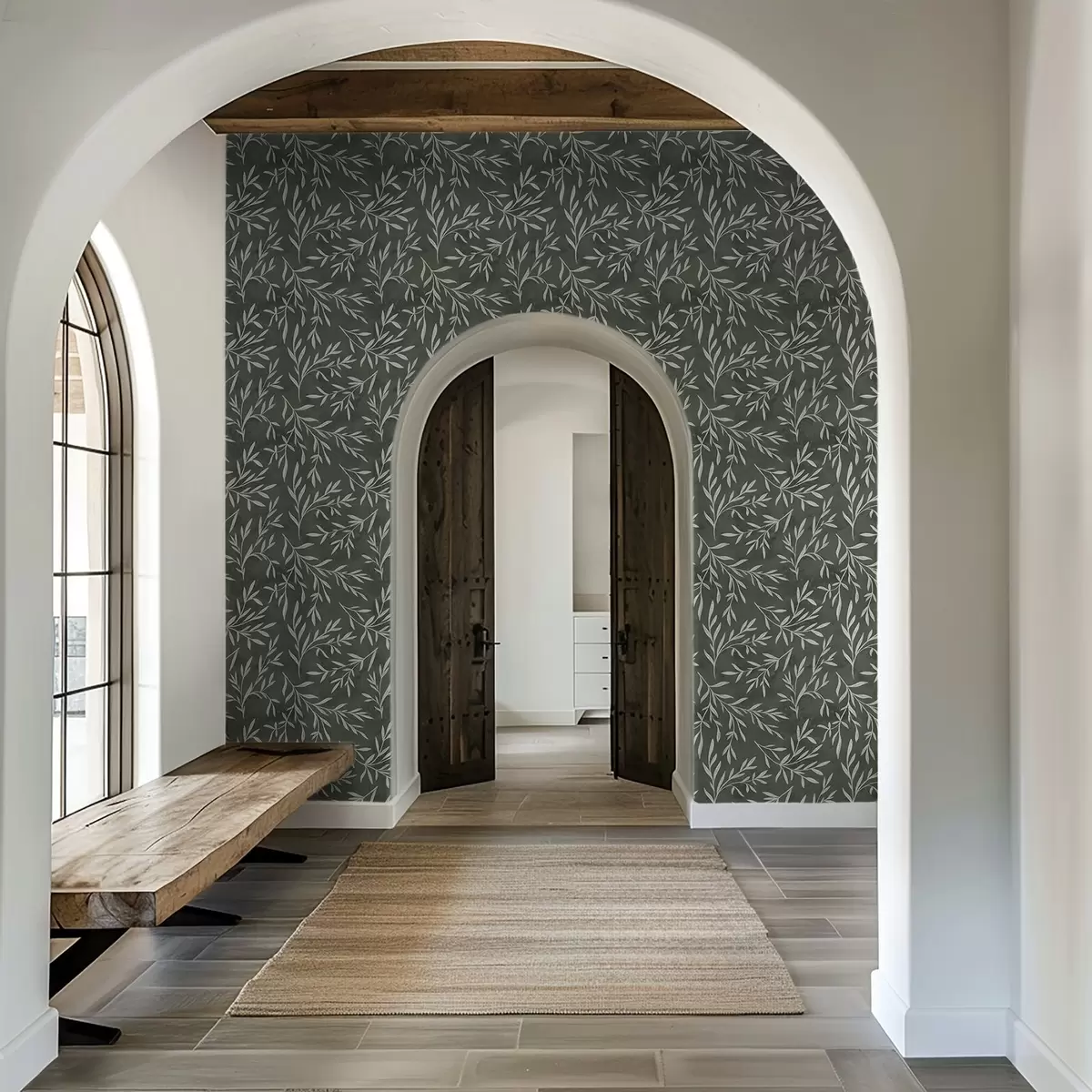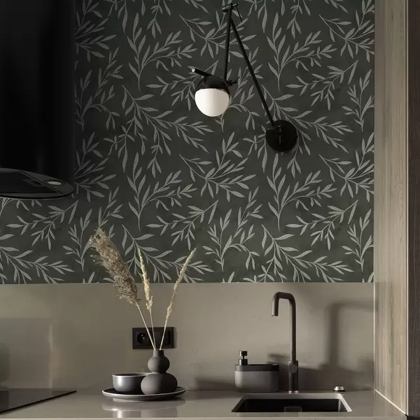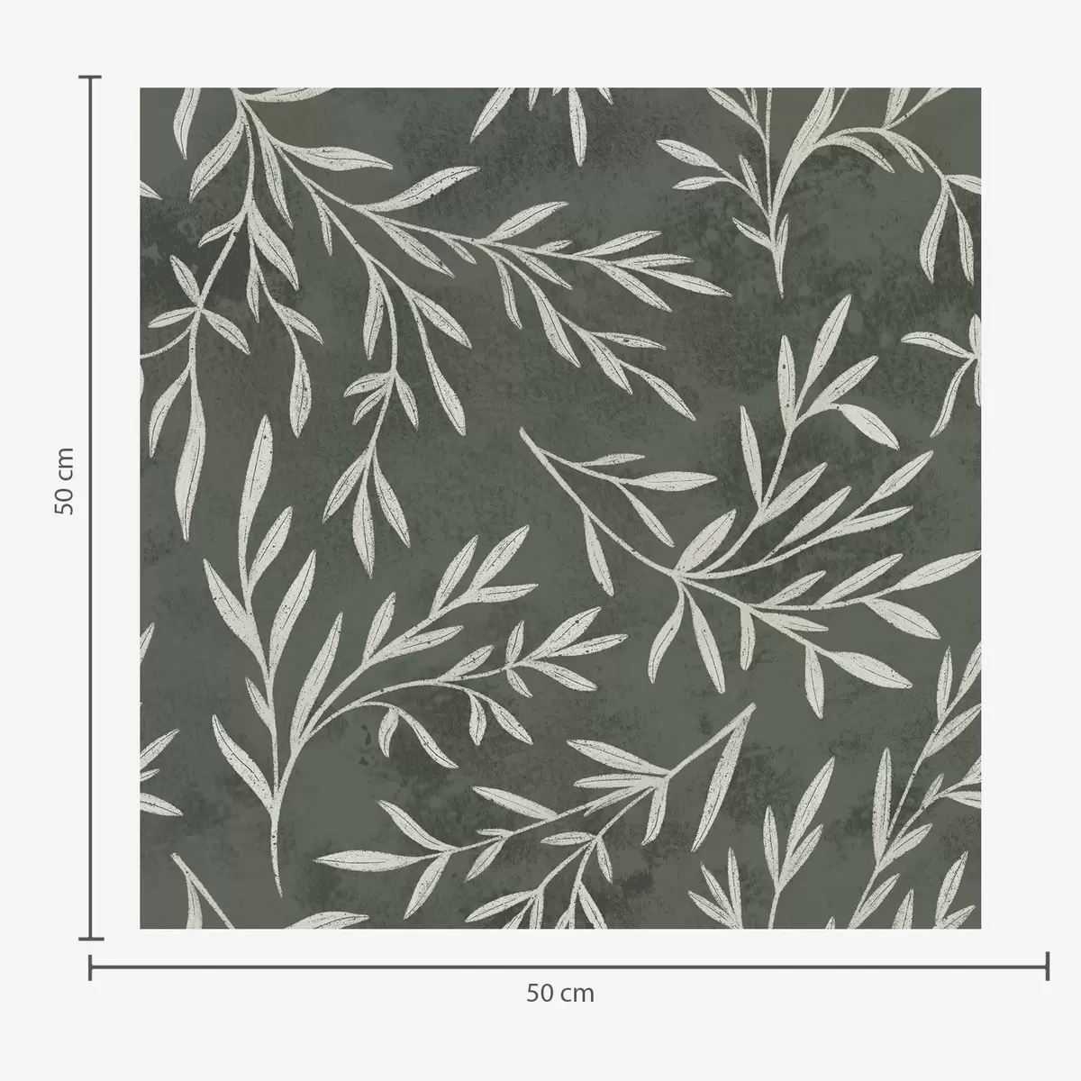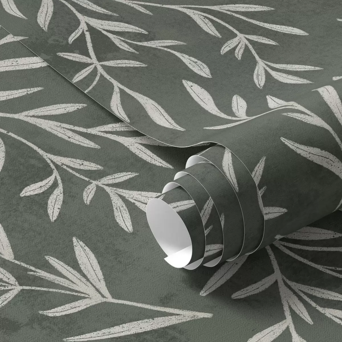 Behang Geschetste witte takken op een diep saliegroene achtergrond Nr. a00936v2