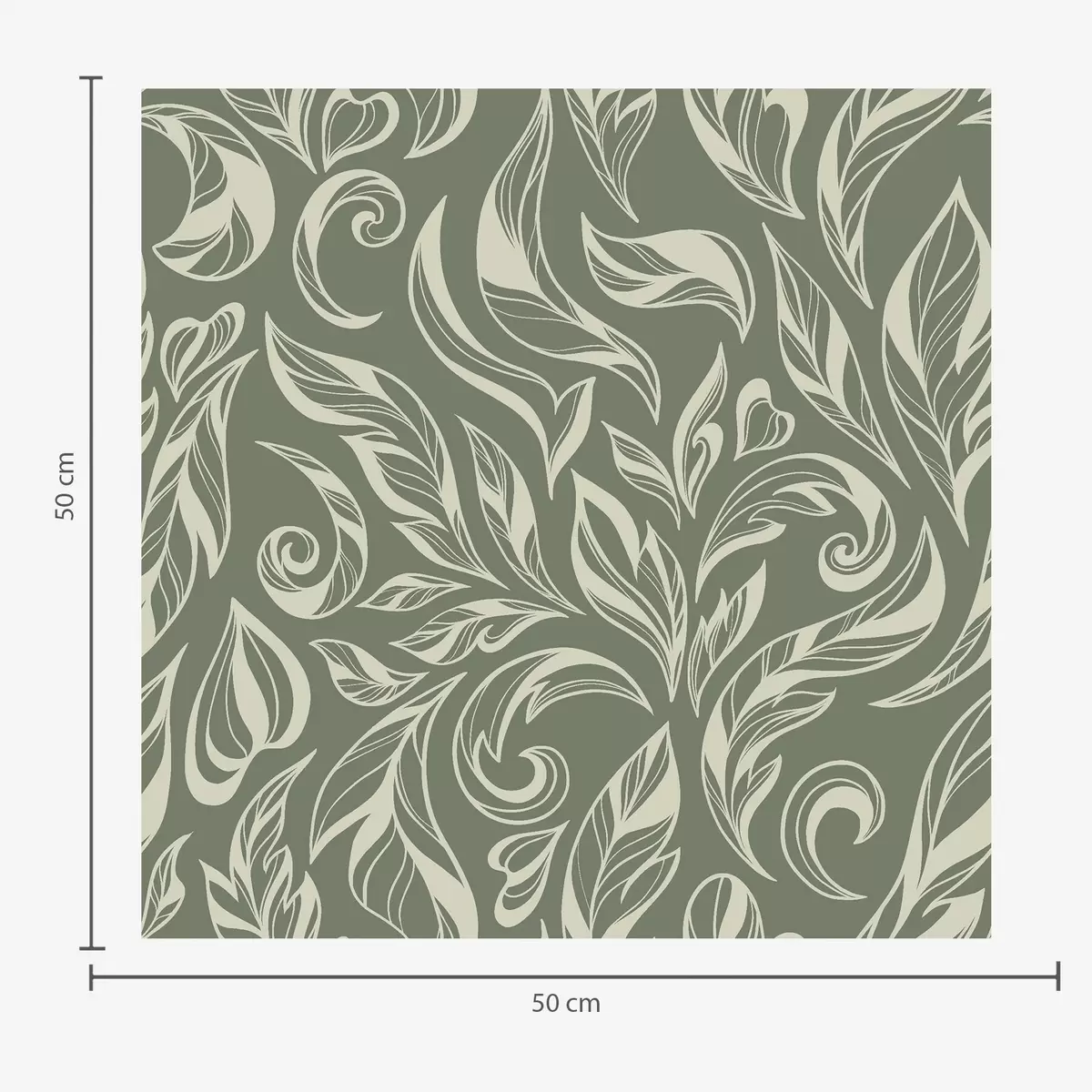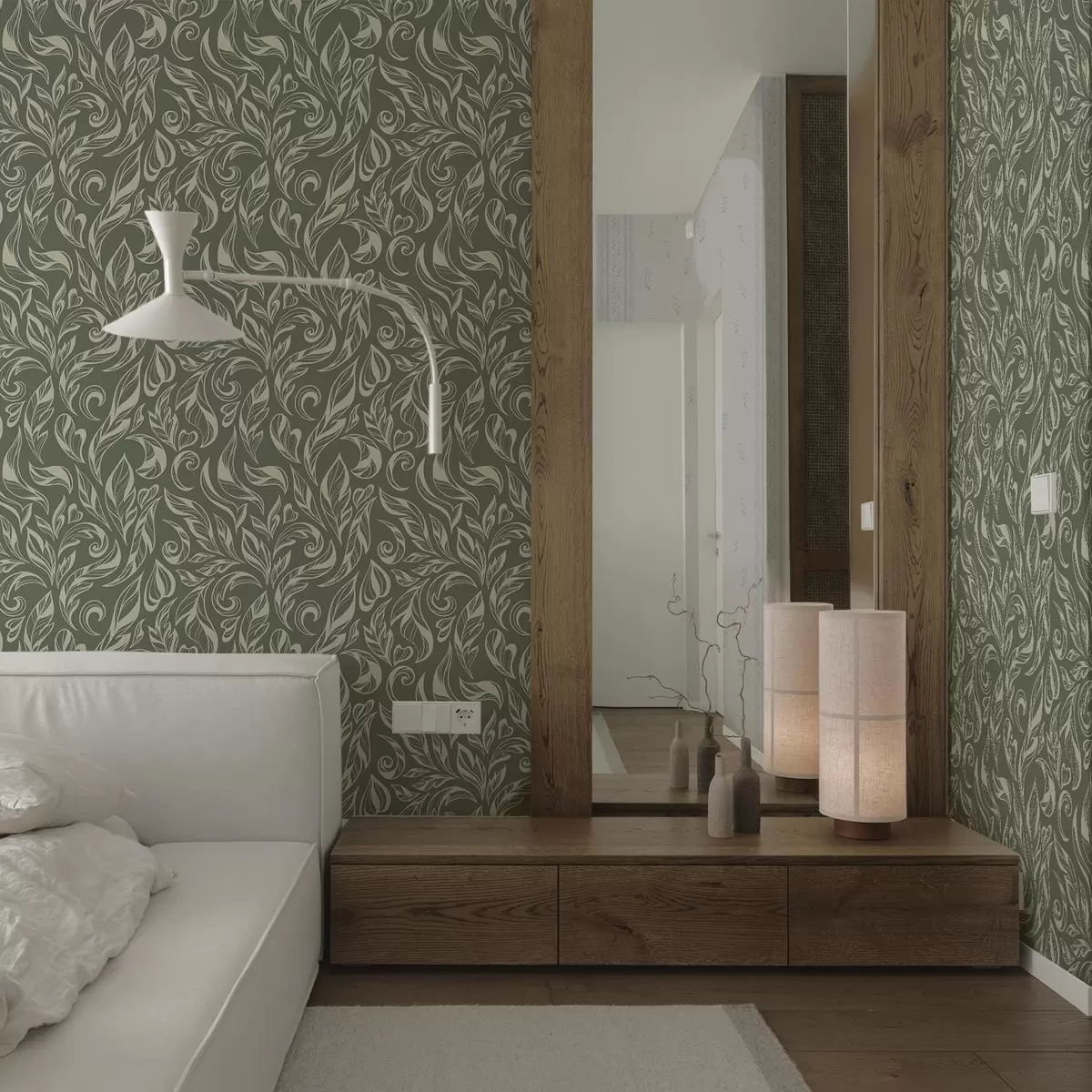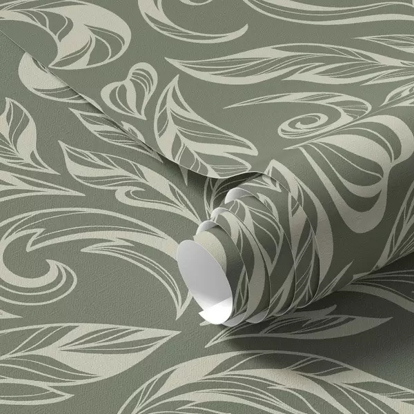 Behang Crèmekleurig bladornament op een groengrijze achtergrond Nr. a00940v2