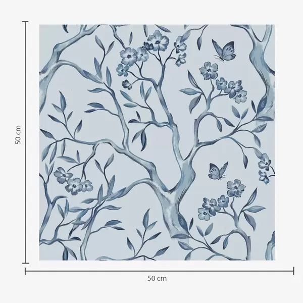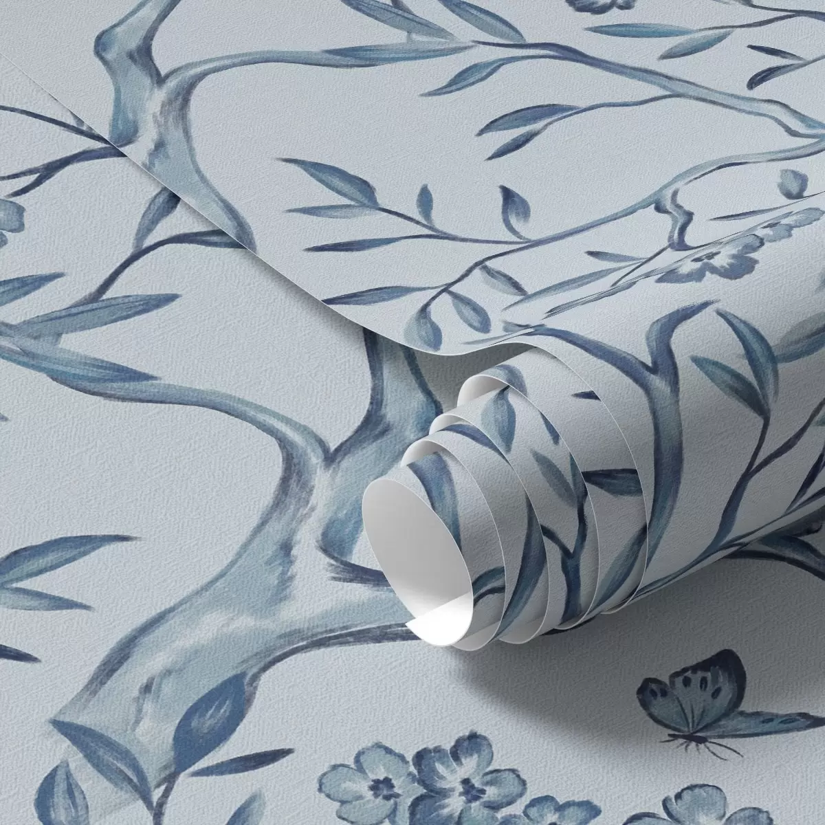 Behang Aquarelblauwe takken met bloemen en vlinders op lichte achtergrond Nr. a00951
