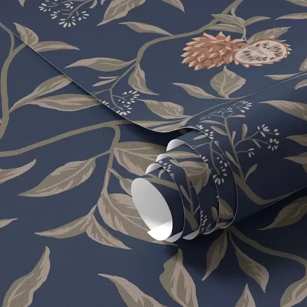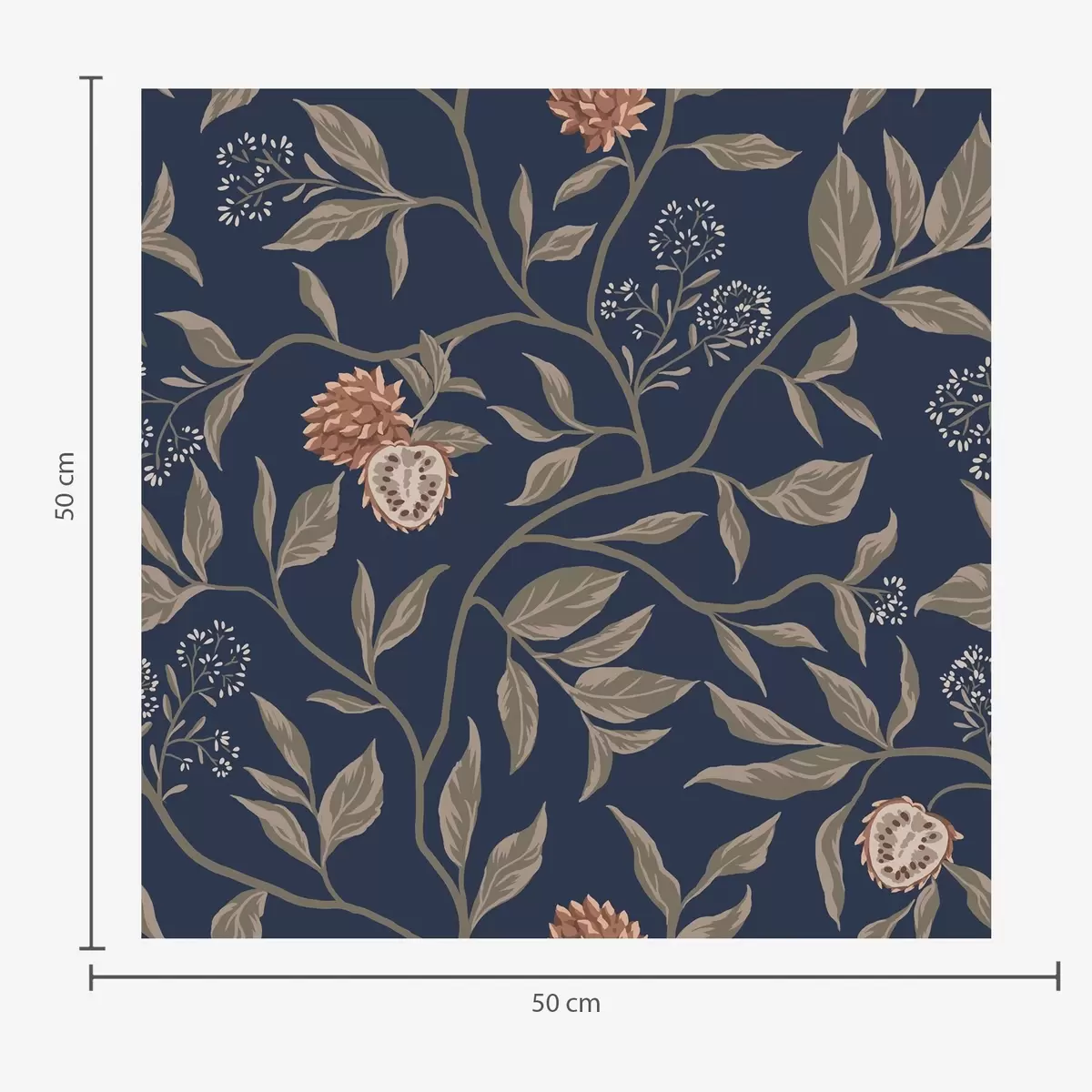 Behang Blauwe tuin met takken, vruchten en kleine bloesems Nr. a00959