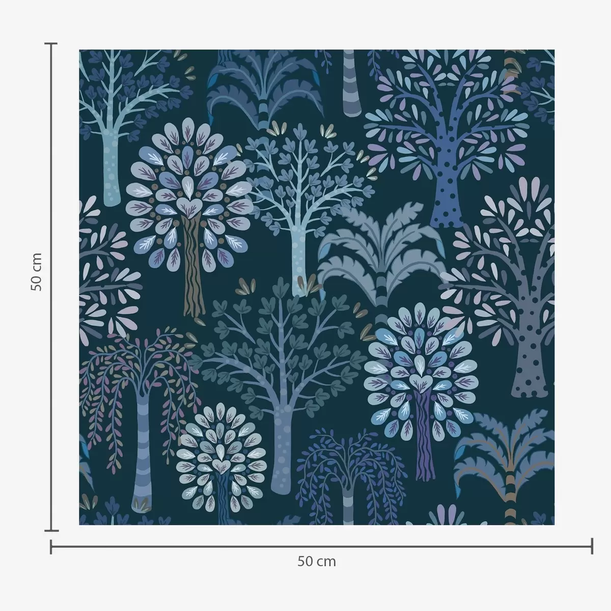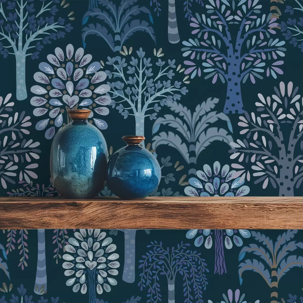Behang Nachtelijk bos met decoratieve bomen in blauwe tinten Nr. a00960v2