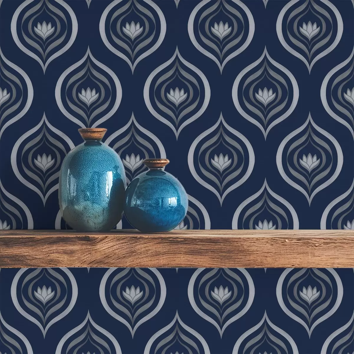 Behang Contrasterende druppelmotieven met een bloem op een donkerblauwe achtergrond Nr. a00977v1