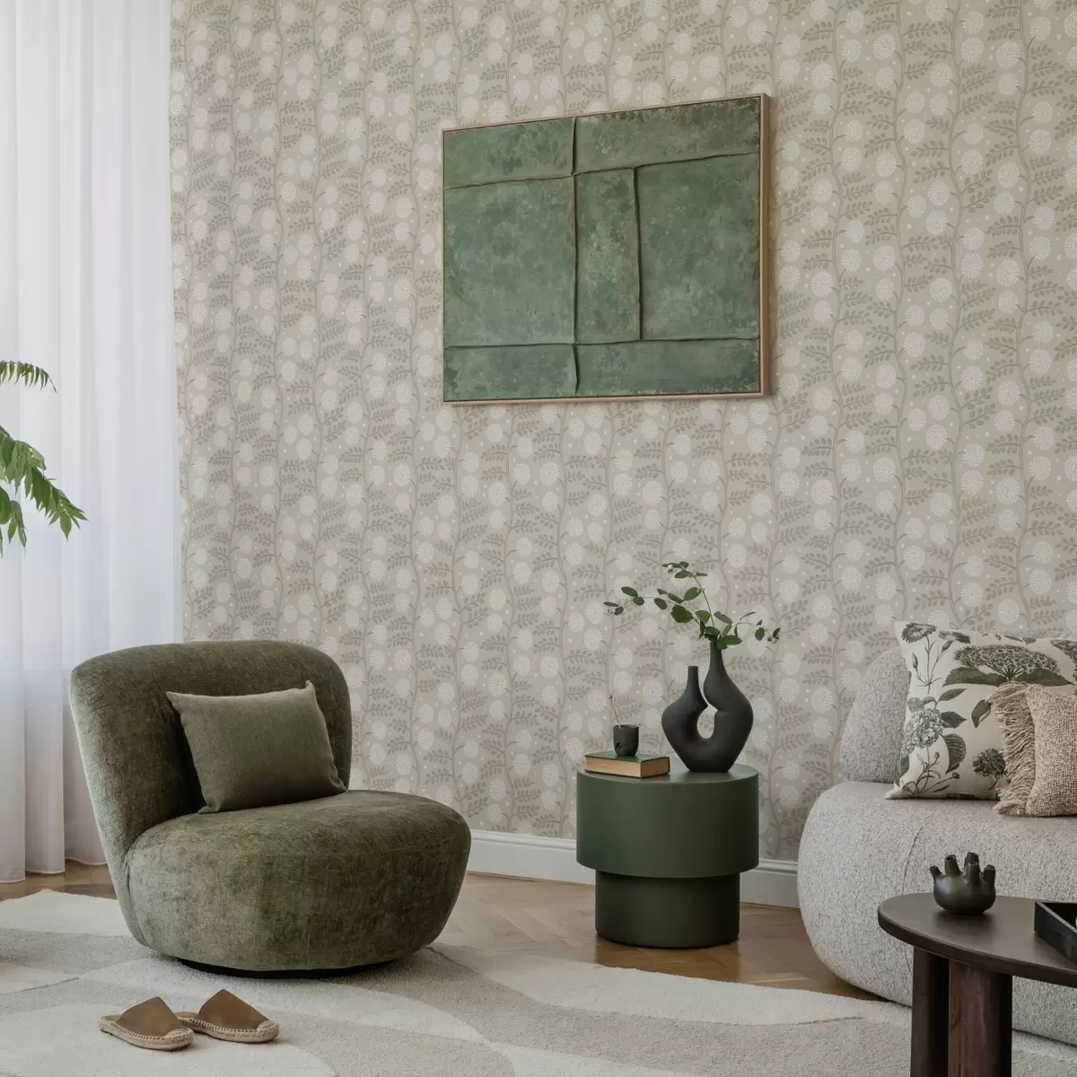 Behang Beige stengels met witte pluizige bloemen en zachte stippen Nr. a00997