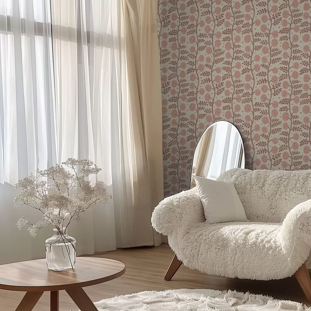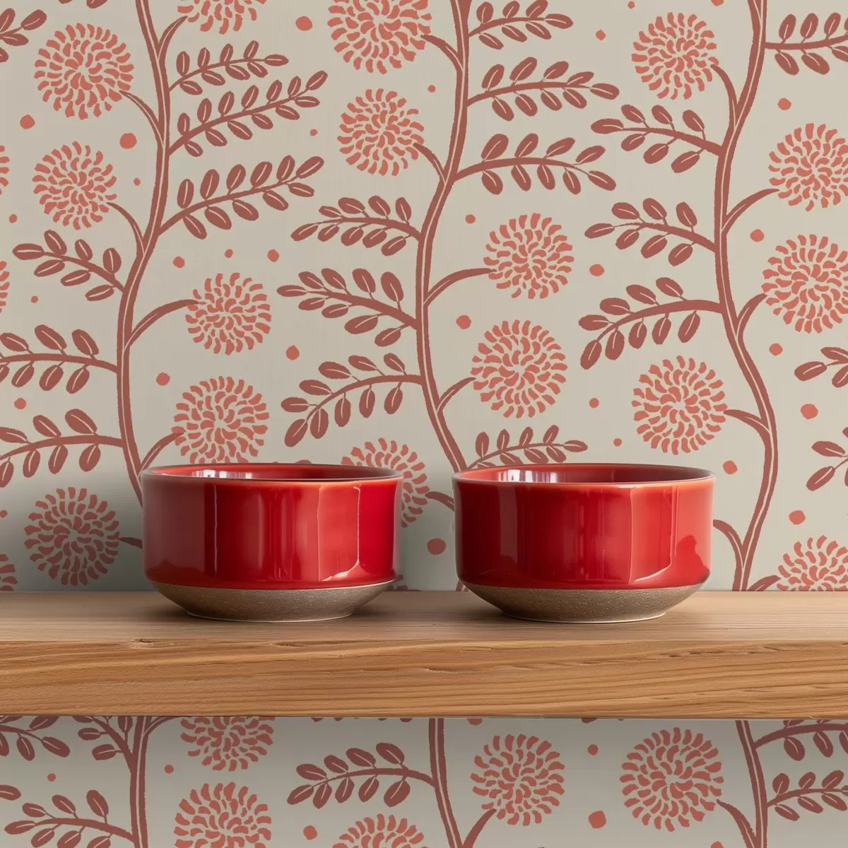 Behang Terracotta stelen met koraalkleurige pluizige bloemen op een crèmekleurige achtergrond Nr. a00997v1