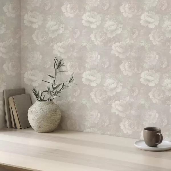 Behang Verbleekte pioenrozen op linnen textuur in een zacht beige kleurenpalet Nr. a01018