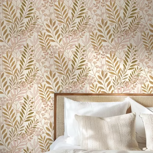 Behang Licht botanisch patroon met delicate roze en haverkleurige bladeren Nr. a01020v1