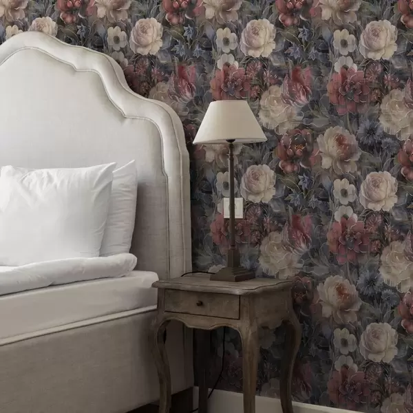 Behang Schilderachtig boeket van grote bloemen op een diepe indigo achtergrond Nr. a01021
