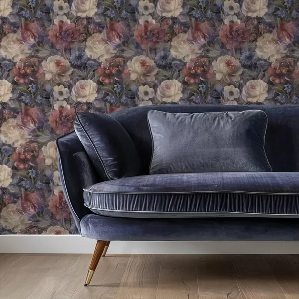 Behang Schilderachtig boeket van grote bloemen op een diepe indigo achtergrond Nr. a01021