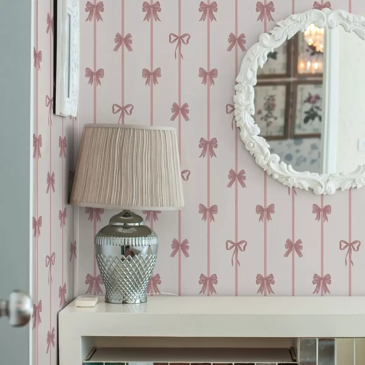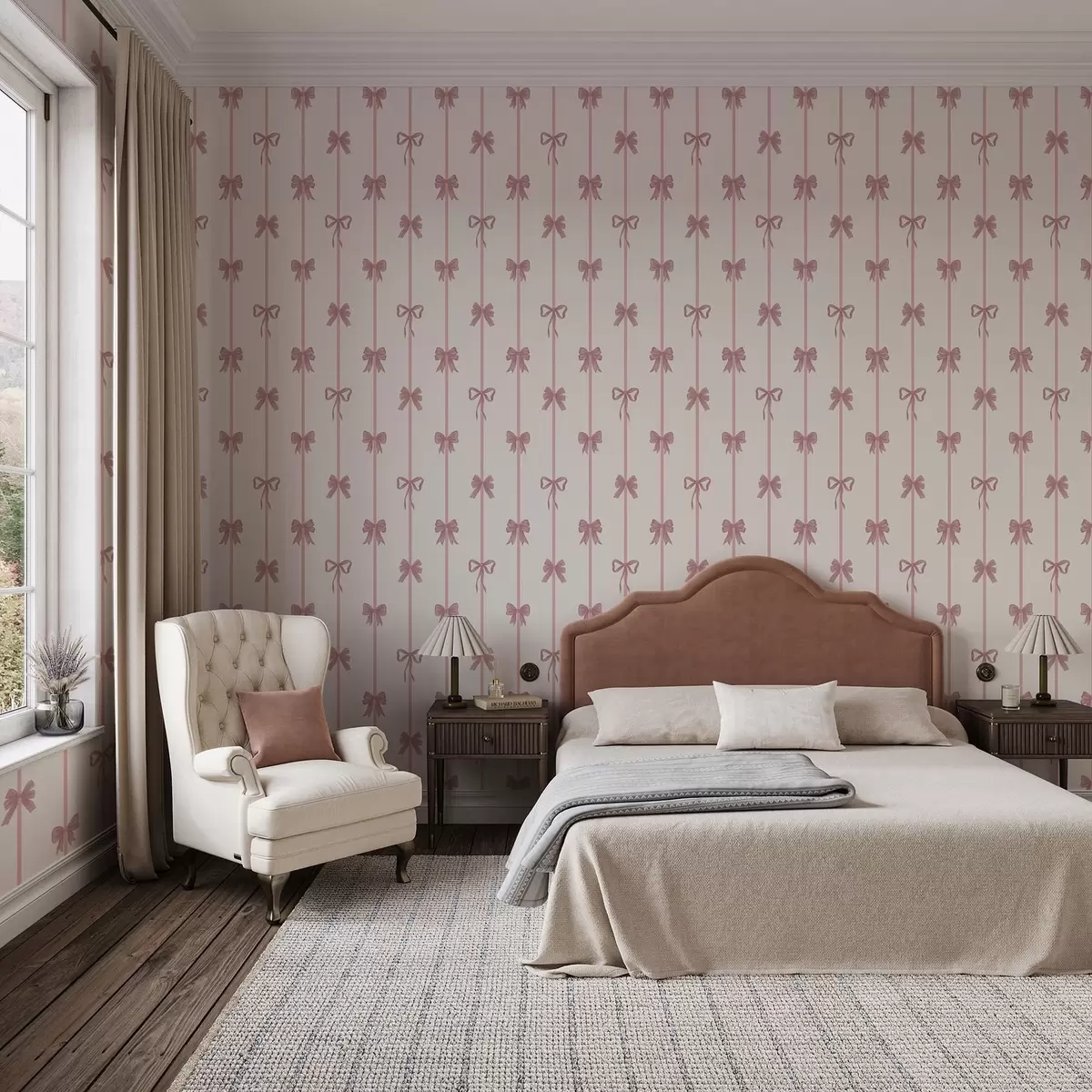 Behang Roze strikken met linten op een lichte achtergrond Nr. a01074
