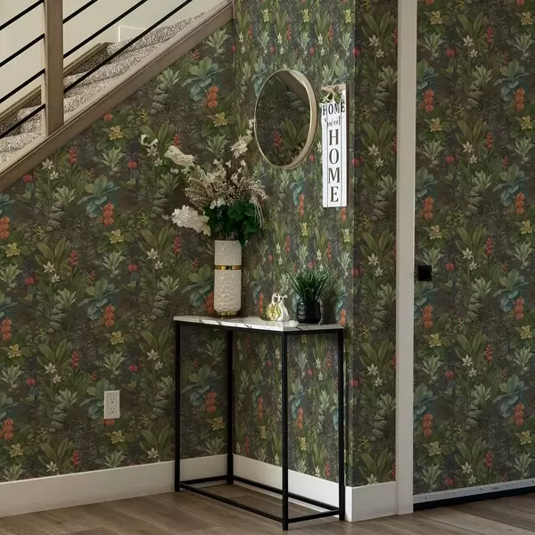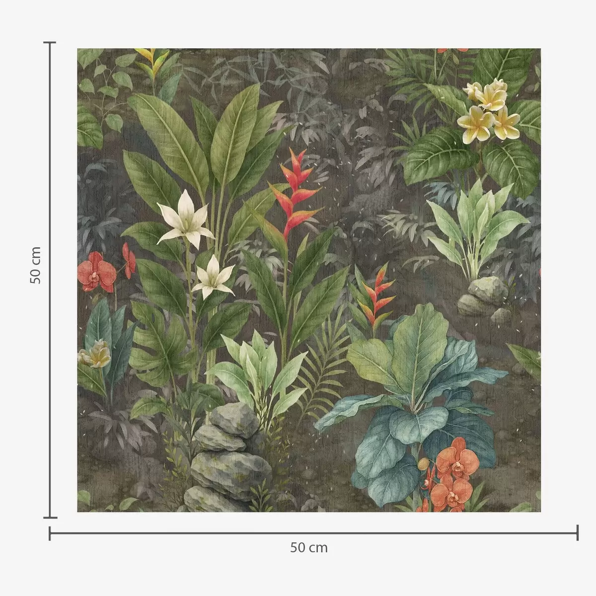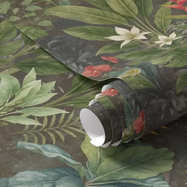 Behang Donkere tropische tuin met heldere bloemen en bladeren Nr. a01079
