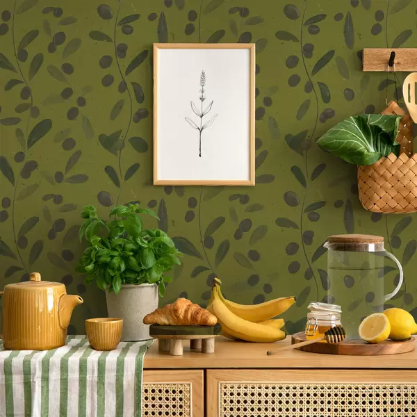 Behang Groene takken met bladeren en bessen op olijfboom Nr. a01113
