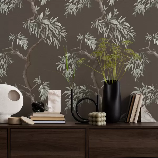 Behang Boomtak met bladeren op bruine achtergrond Nr. a01117v3