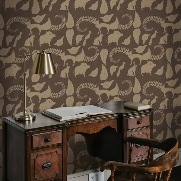 Behang Bospatroon met dieren op bruine achtergrond a01121