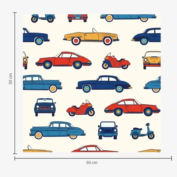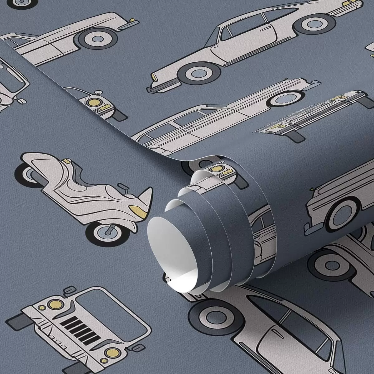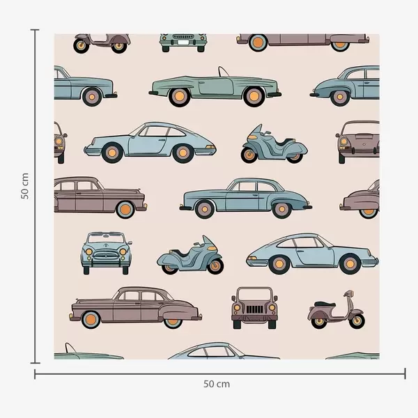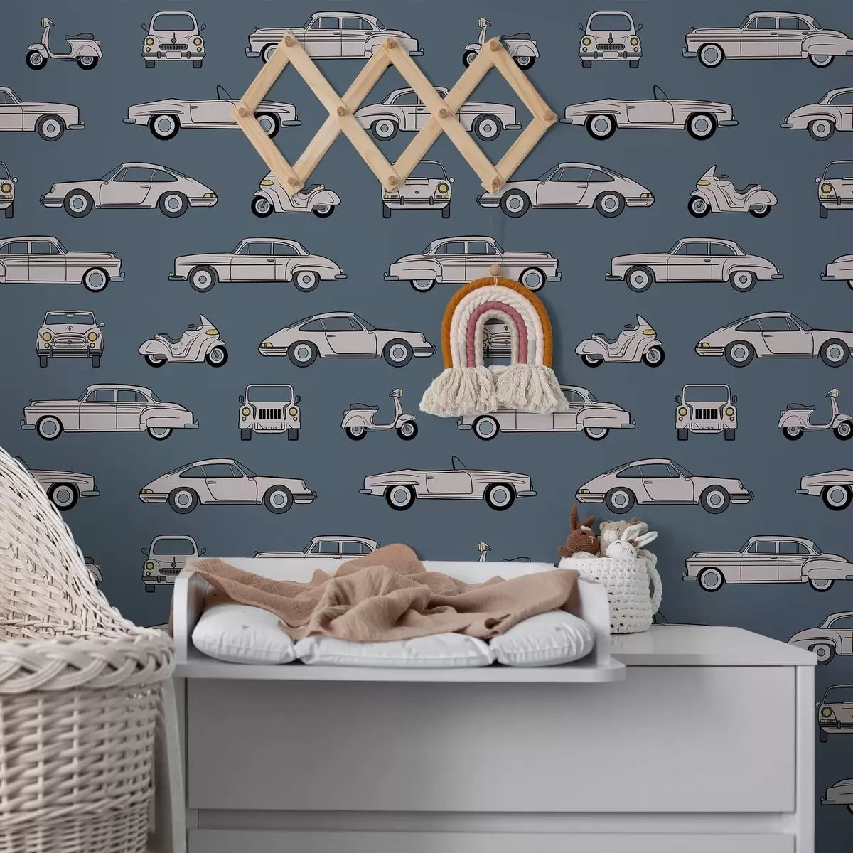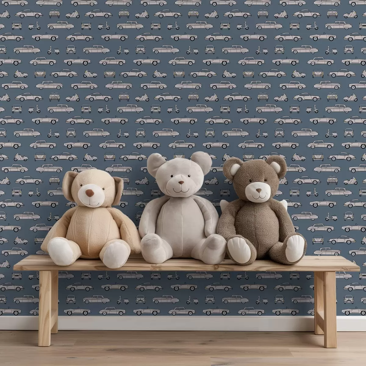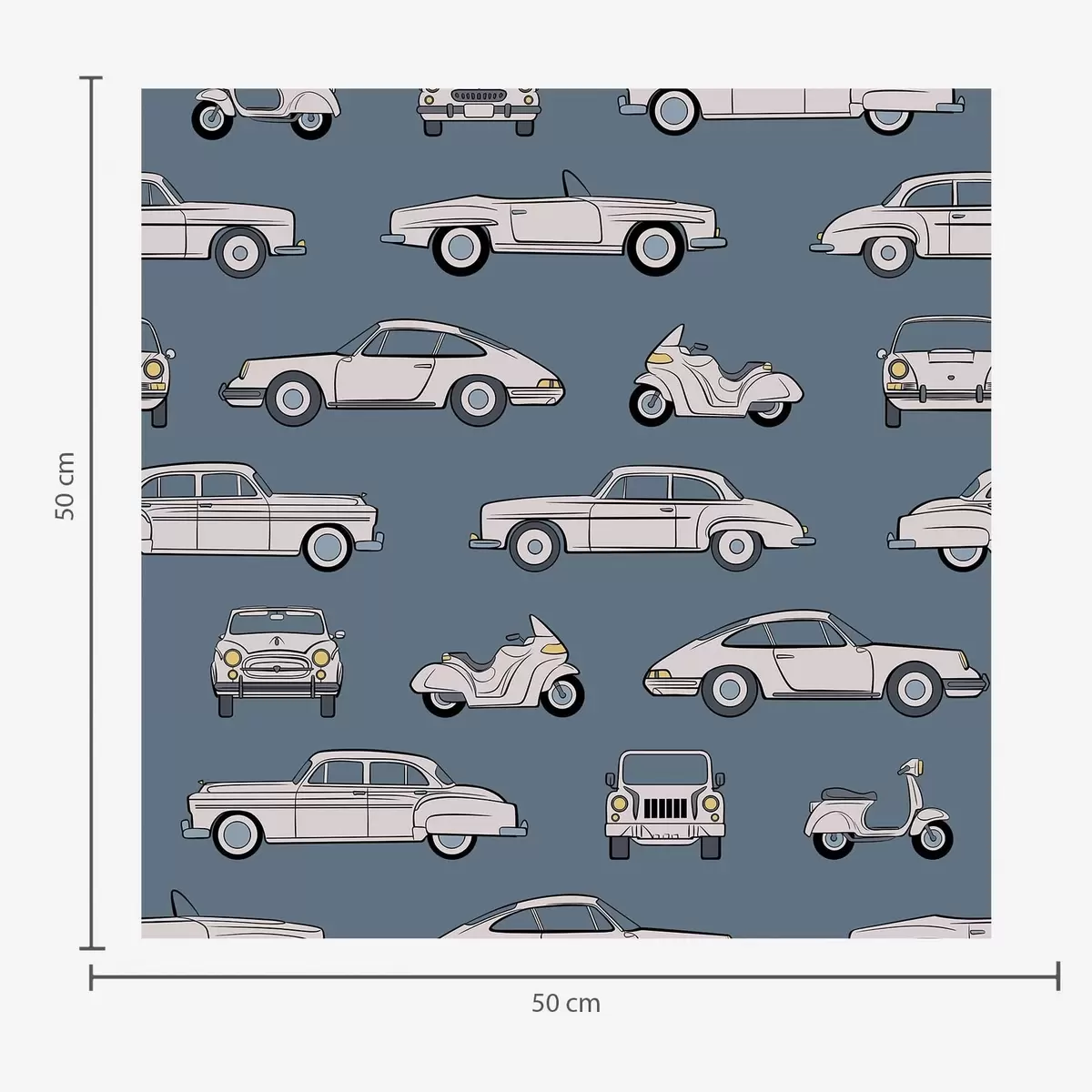 Behang Retro-auto's en -scooters op een blauwe achtergrond Nr. a01178