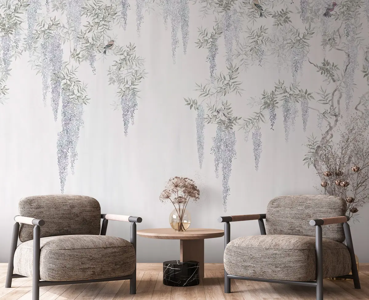 Fotobehang Bloemen van blauweregen, blauweregen, minimalisme, zwart-wit, loft en Japanse stijl N° u96928