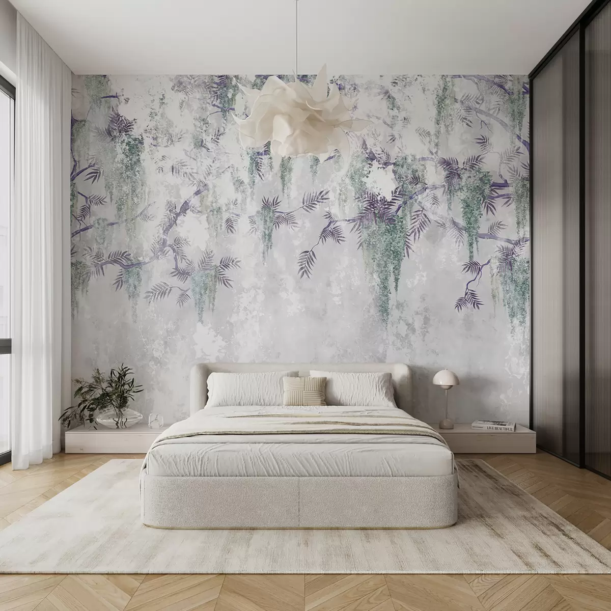 Fotobehang Hangende trendy grunge takken met paarse bloemen in blauwe kleuren N° u73816v1