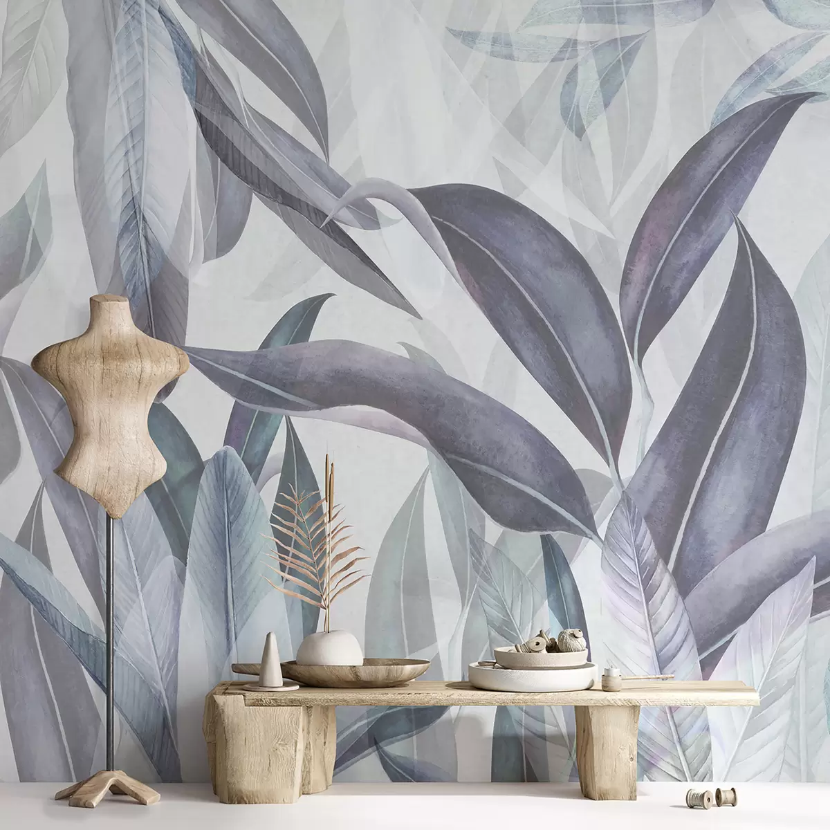 Fotobehang Groene en roze palmbladeren in blauwe kleuren N° u94302v1