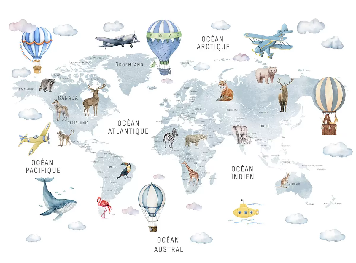 Fotobehang Kinderkaart in aquarelstijl met dieren en heteluchtballonnen. Franse taal. Blauwe kleur. N° c00001frv1
