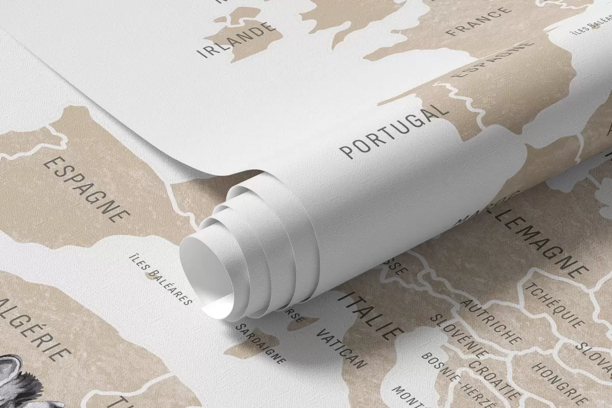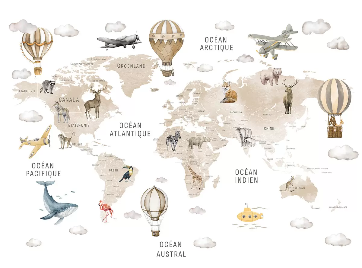 Fotobehang Kinderkaart in aquarelstijl met dieren en heteluchtballonnen. Franstalig. Beige kleur. N° c00001frv2