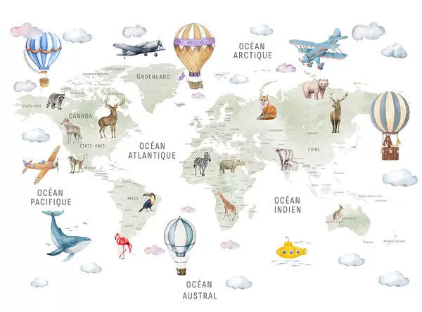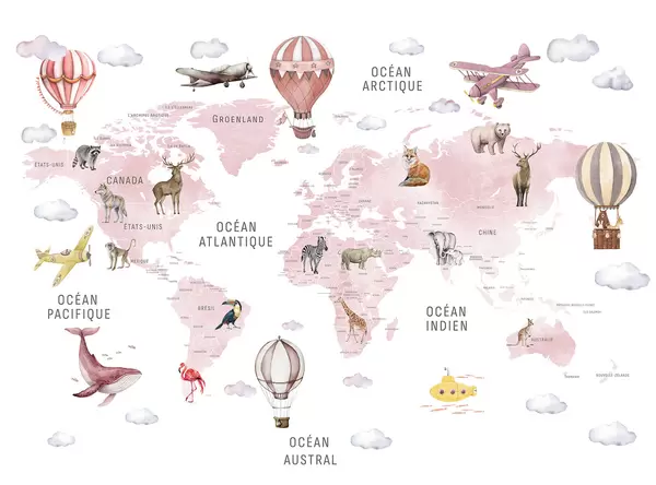 Fotobehang Kinderkaart in aquarelstijl met dieren en heteluchtballonnen. Franse taal. Roze kleur. N° c00001frv3
