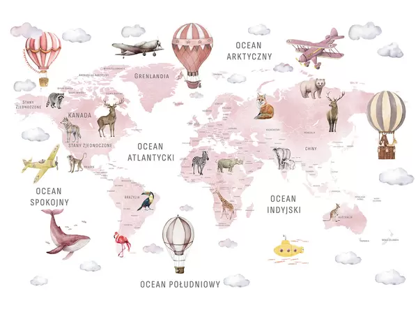 Fotobehang Kinderkaart in aquarelstijl met dieren en heteluchtballonnen. Poolse taal. Blauwe kleur. N° c00001plv1