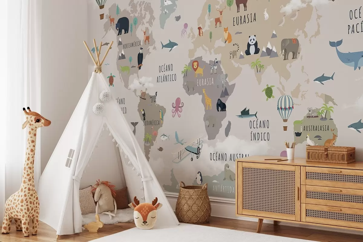 Fotobehang Wereldkaart voor kinderen met dieren en heteluchtballonnen. Spaanse taal N° c00002es