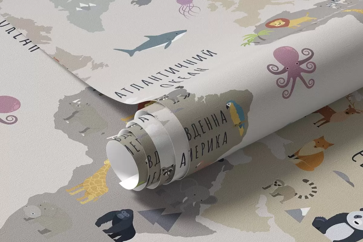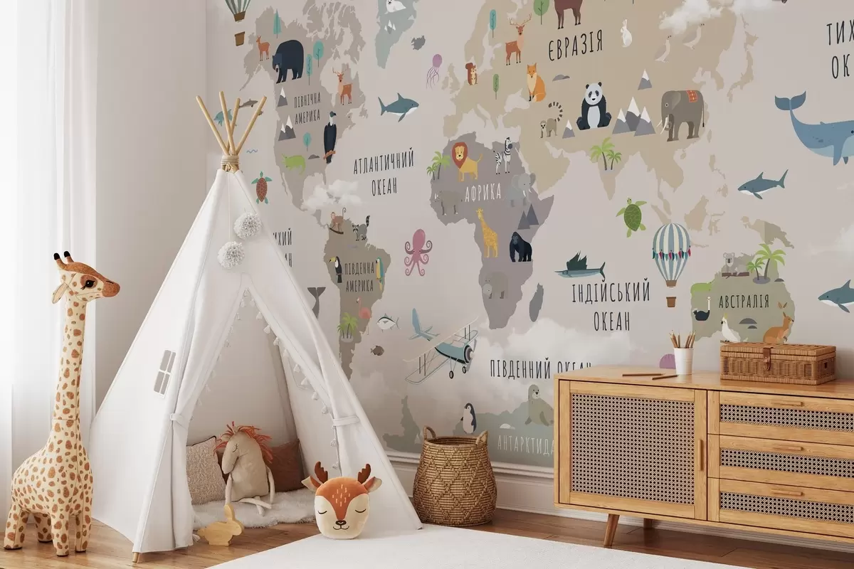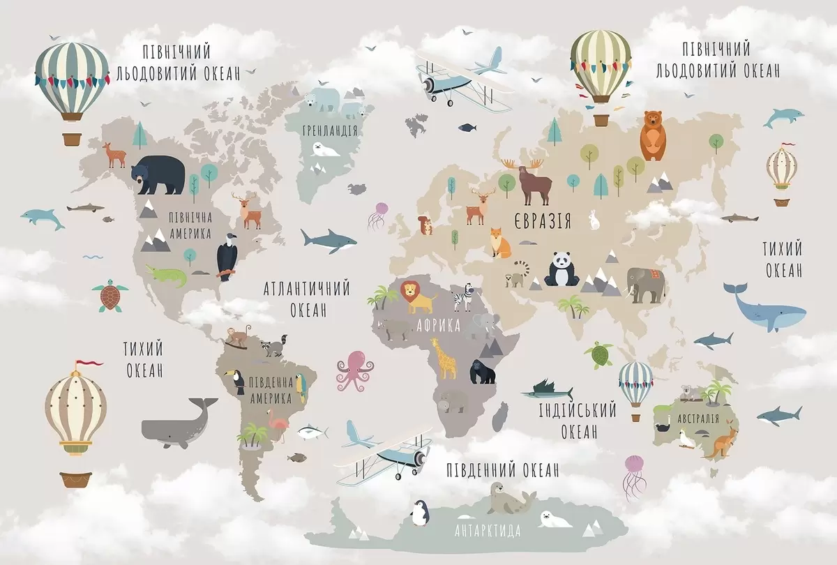 Fotobehang Wereldkaart voor kinderen met dieren en heteluchtballonnen. Oekraïense taal N° c00002uk