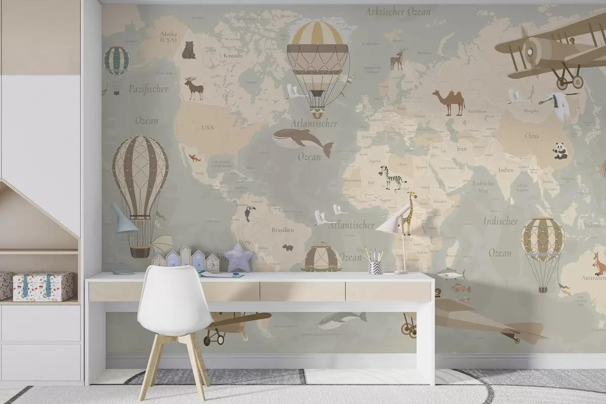 Fotobehang Wereldkaart voor kinderen met dieren, vliegtuigen en heteluchtballonnen. Duitse taal. Beige kleur. N° c00003de