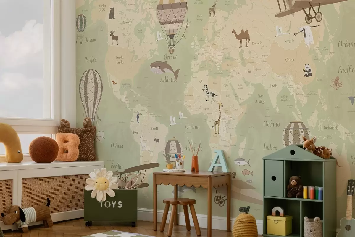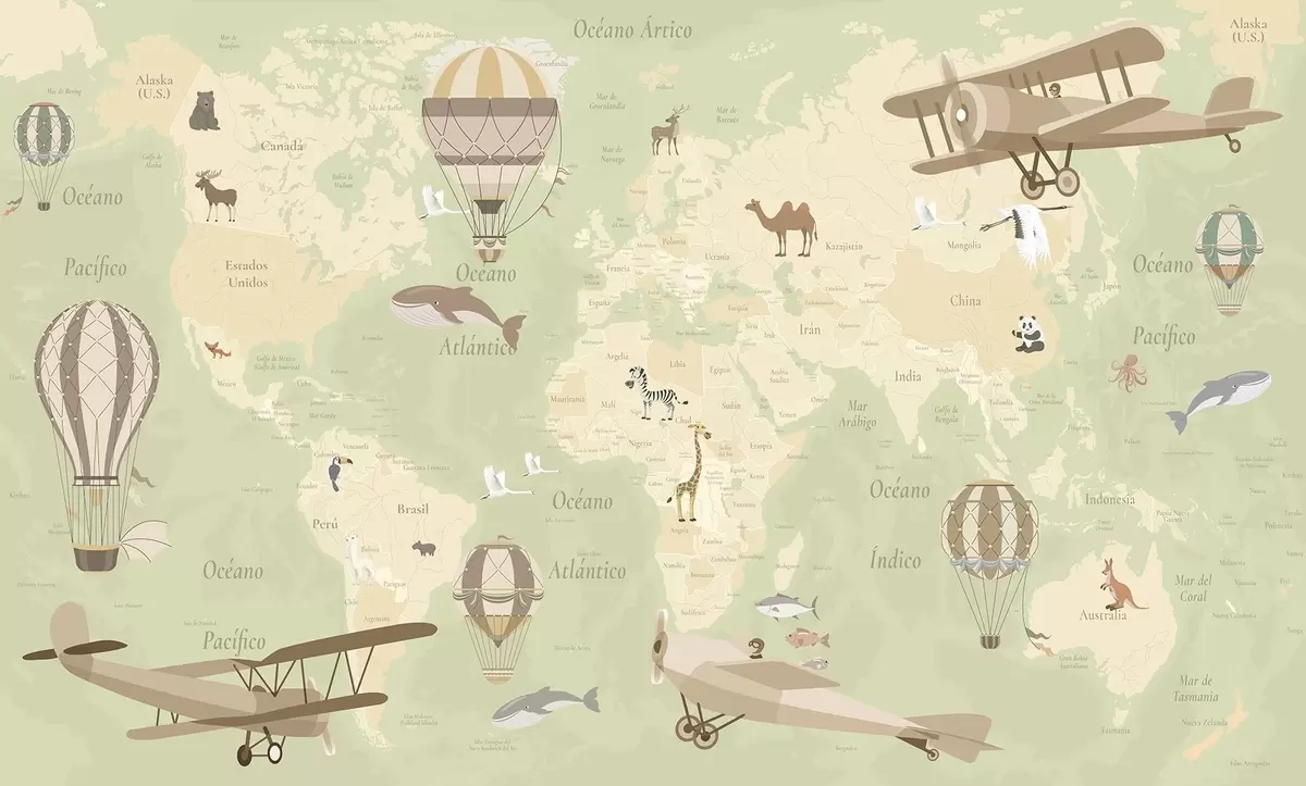 Fotobehang Wereldkaart voor kinderen met dieren, vliegtuigen en heteluchtballonnen. Spaanse taal. Groene kleur N° c00003esv2