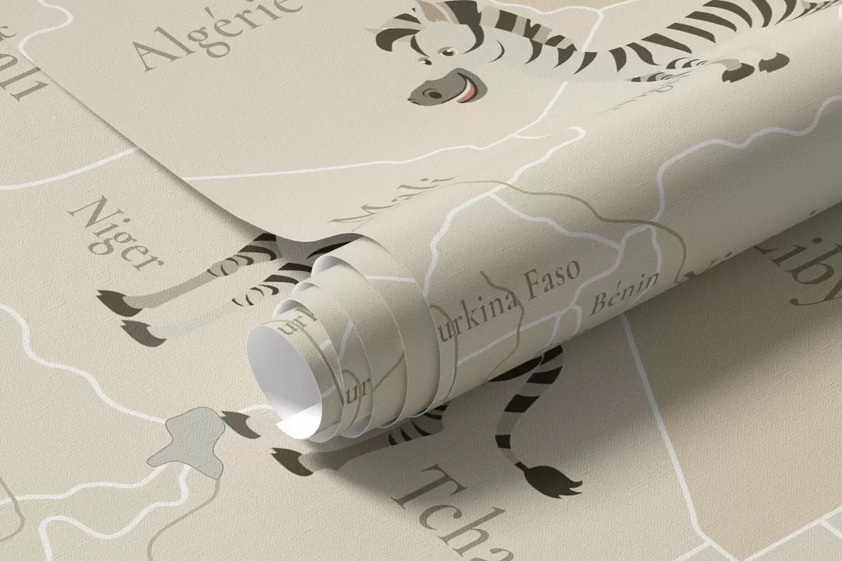 Fotobehang Wereldkaart voor kinderen met dieren, vliegtuigen en heteluchtballonnen. Franse taal. Beige kleur N° c00003fr