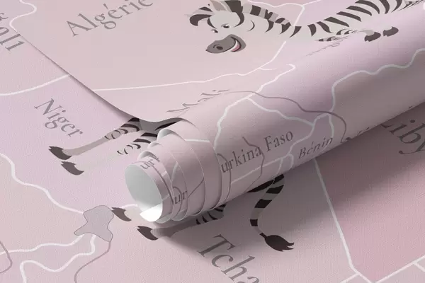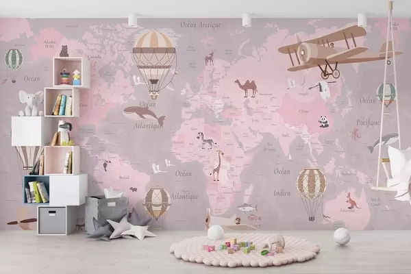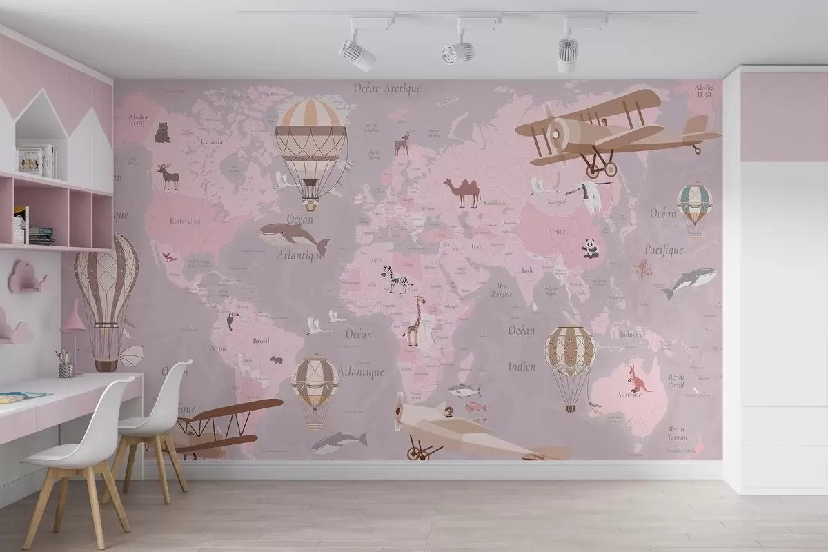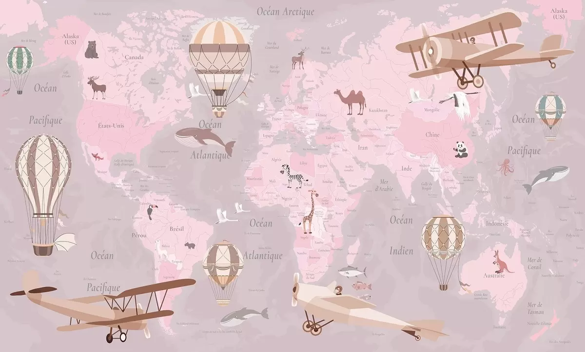 Fotobehang Wereldkaart voor kinderen met dieren, vliegtuigen en heteluchtballonnen. Franse taal. Roze kleur N° c00003frv3