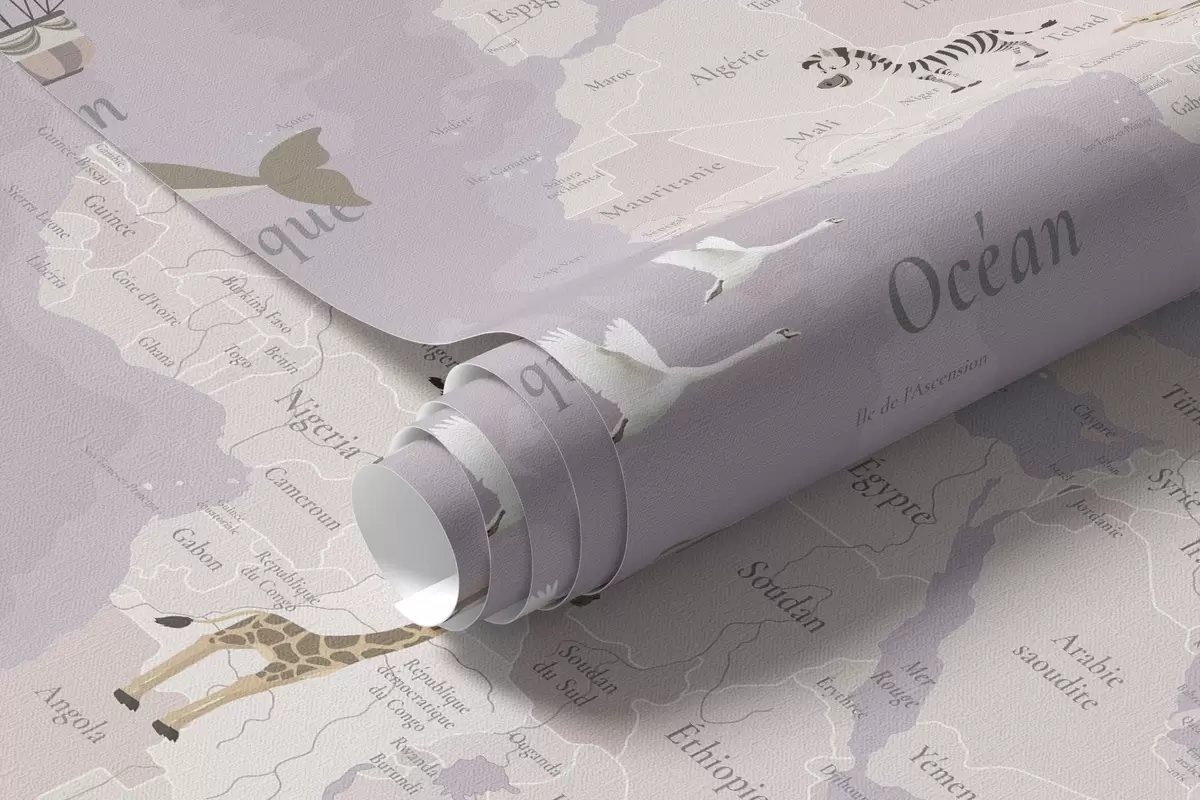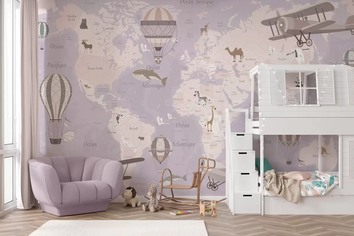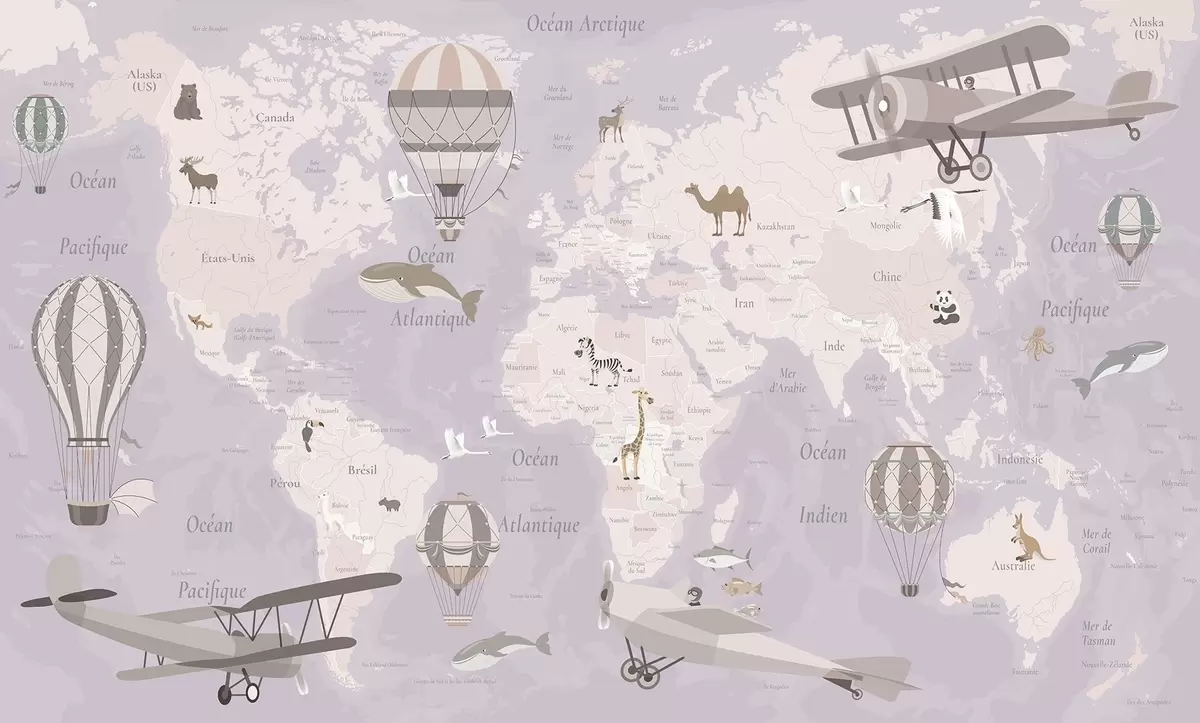 Fotobehang Wereldkaart voor kinderen met dieren, vliegtuigen en heteluchtballonnen. Franse taal. Paarse kleur N° c00003frv4
