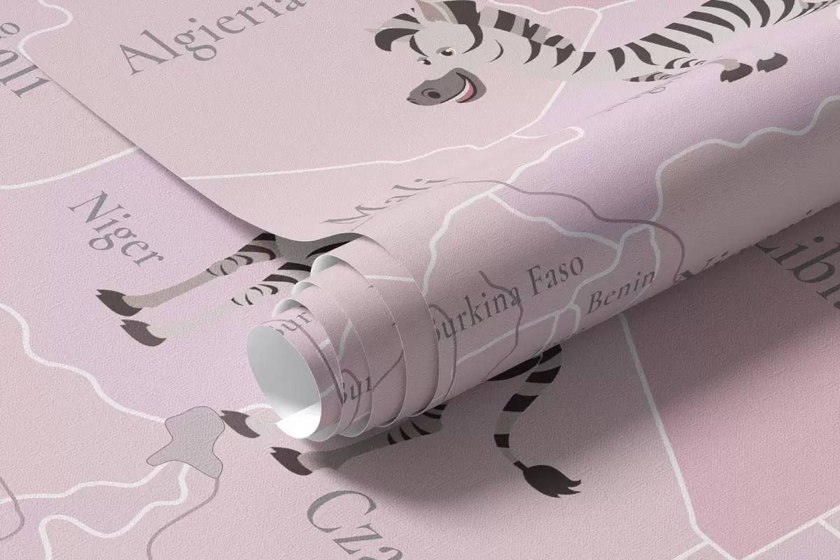 Fotobehang Wereldkaart voor kinderen met dieren, vliegtuigen en heteluchtballonnen. Poolse taal. Roze kleur N° c00003plv3