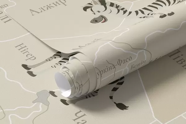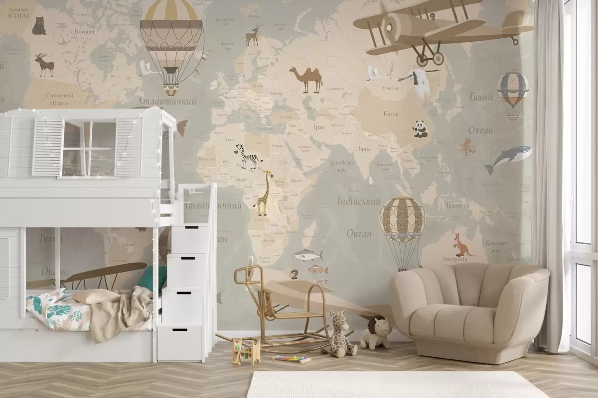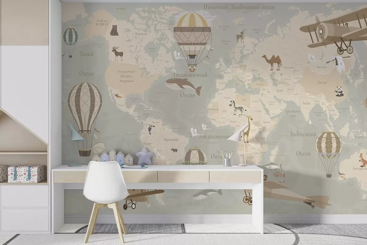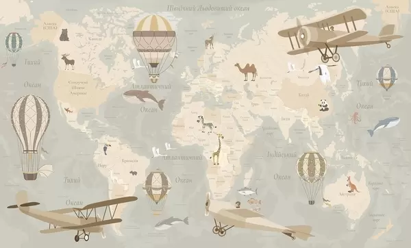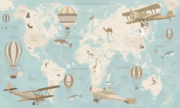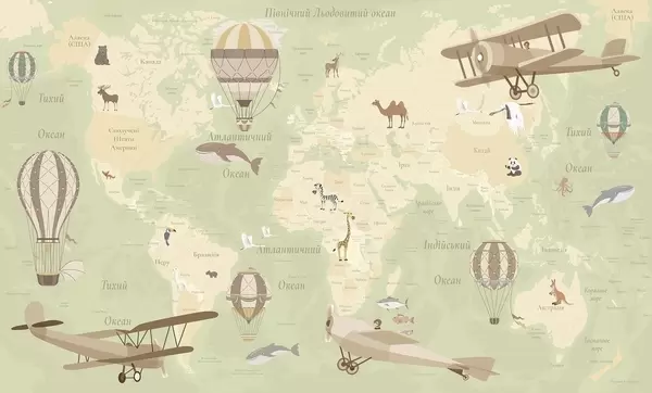 Fotobehang Wereldkaart voor kinderen met dieren, vliegtuigen en heteluchtballonnen. Oekraïense taal. Beige kleur N° c00003uk