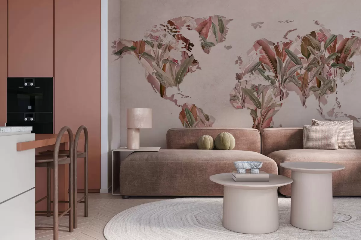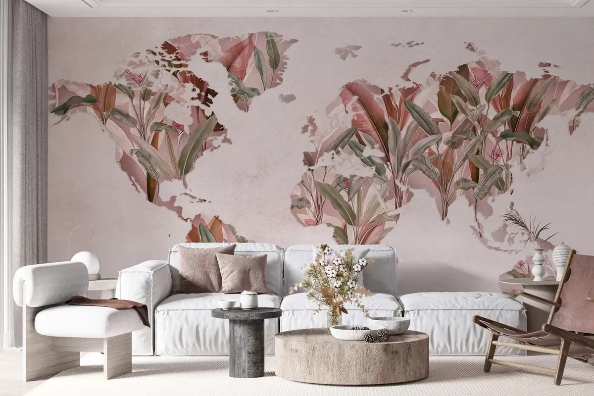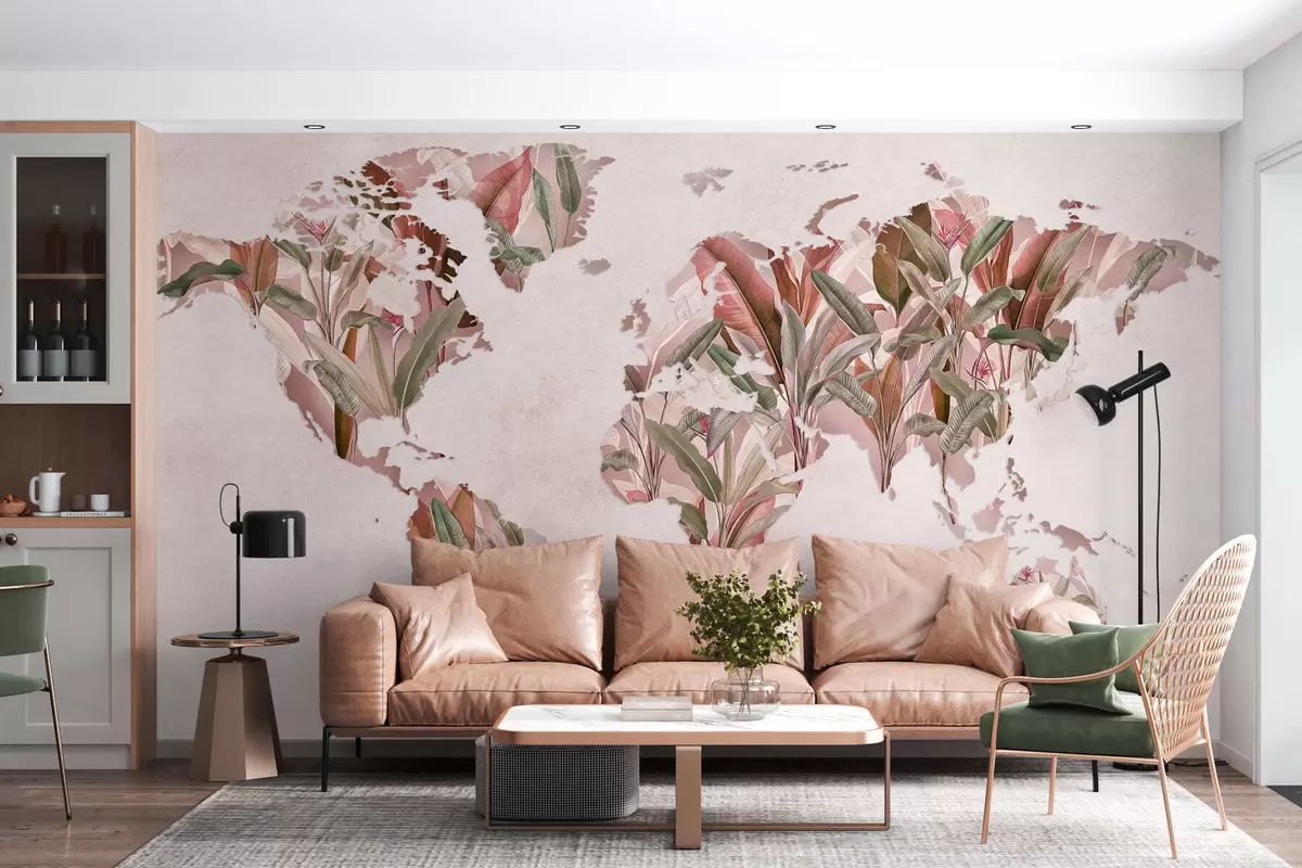 Fotobehang Een roze wereldkaart gemaakt van bananenbladeren N° c00007v2