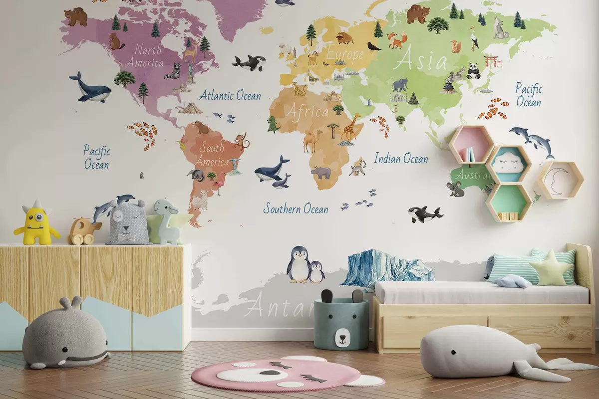 Fotobehang Een kleurenkaart in aquarelstijl met afbeeldingen van dieren, planten en architectuur. Bijschriften in het Engels N° c00009en