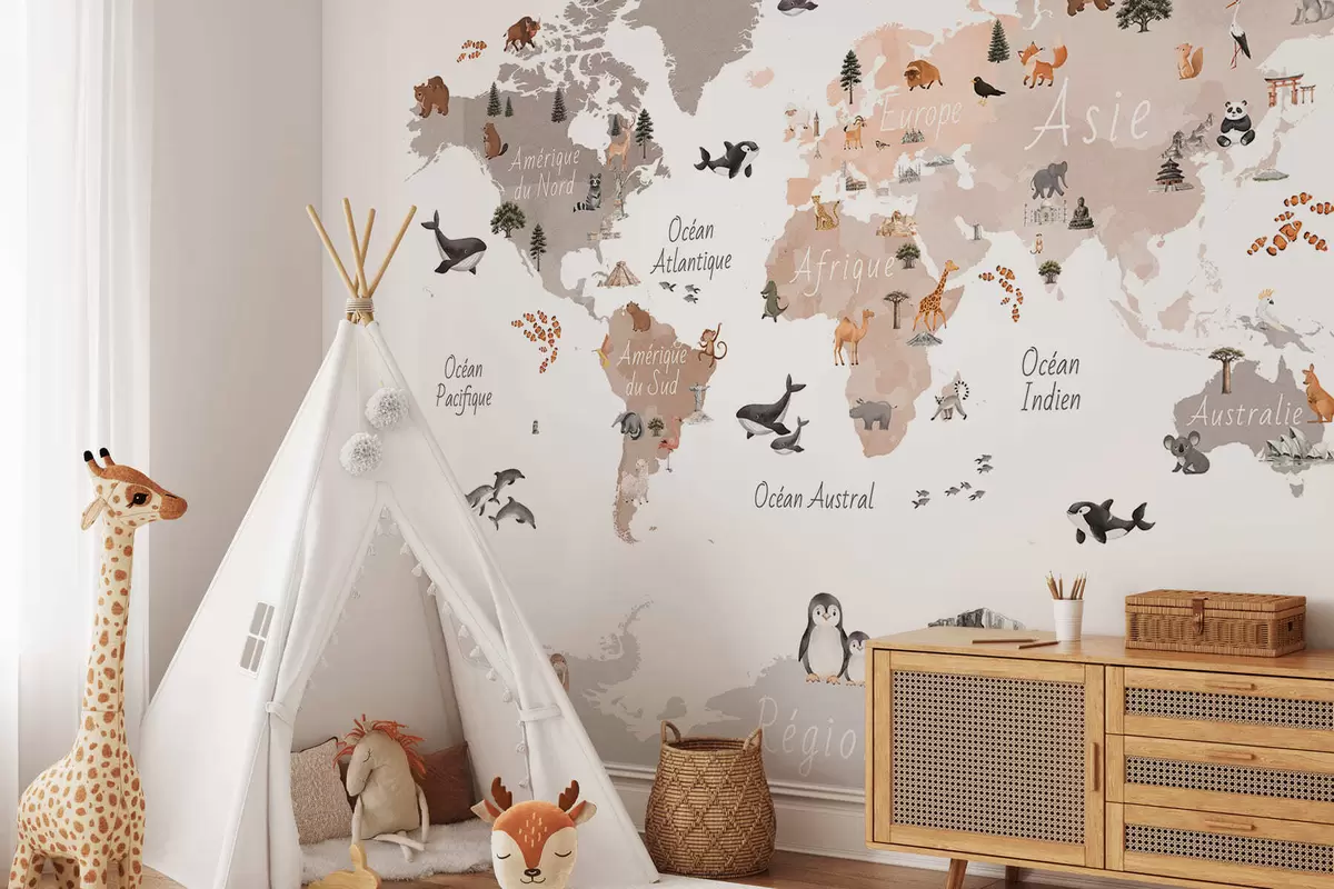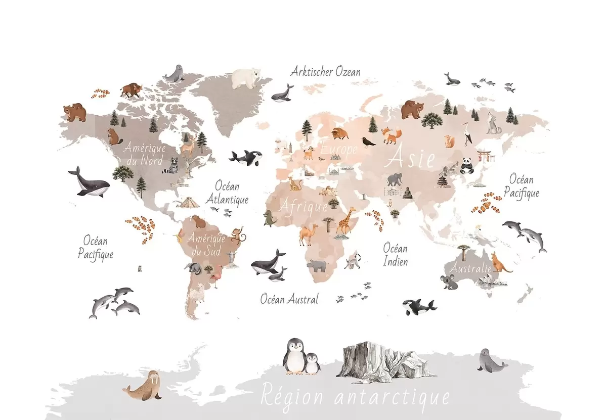 Fotobehang Een beige kaart in aquarelstijl met afbeeldingen van dieren, planten en architectuur. Bijschriften in het Frans N° c00009frv3