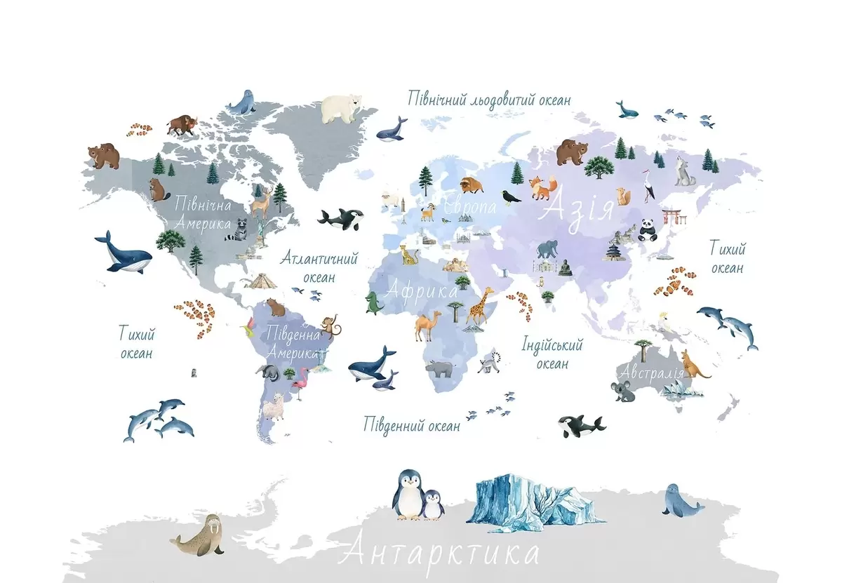 Fotobehang Een blauwe kaart in aquarelstijl met afbeeldingen van dieren, planten en gebouwen. Bijschriften in het Oekraïens N° c00009ukv1