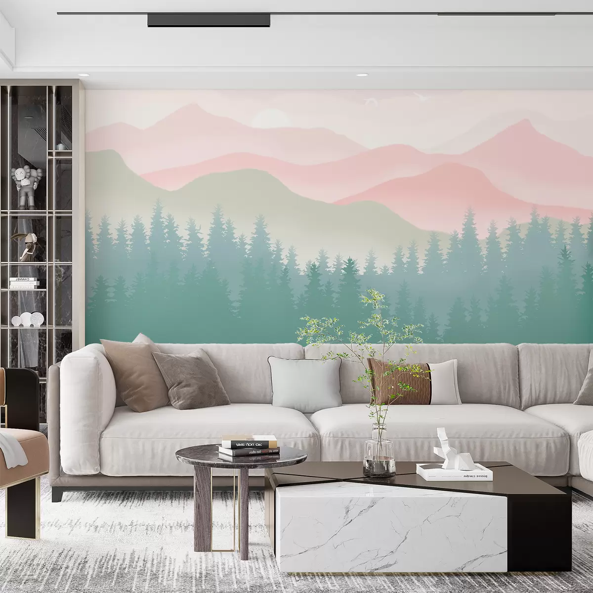 Fotobehang Mistige bergen met dennenbos, zachte natuurlijke kleuren, roze en groen N° u98774