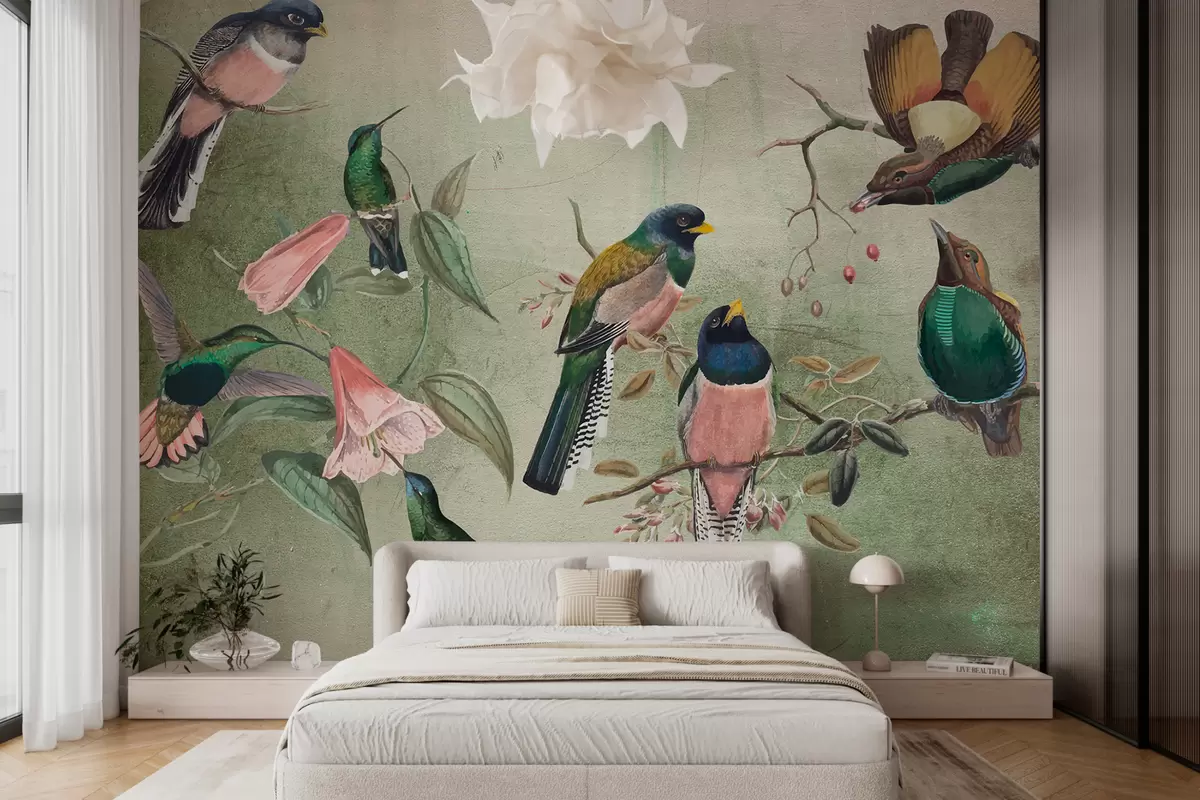 Fotobehang Een groep kleurrijke vogels zat op takken op de gestructureerde achtergrond N° w00543