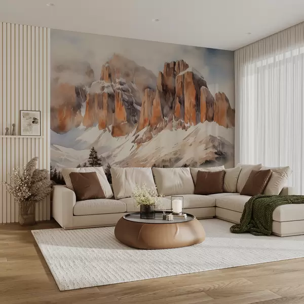 Fotobehang Besneeuwde vallei aan de voet van de Dolomieten berg aquarel N° w00945