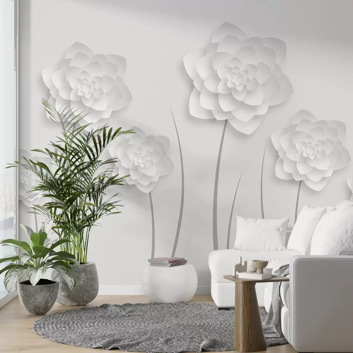 Fotobehang Grote bloemen met imitatie van volume in papierstijl op een lichtgrijze achtergrond met een grijze steel N° w01021