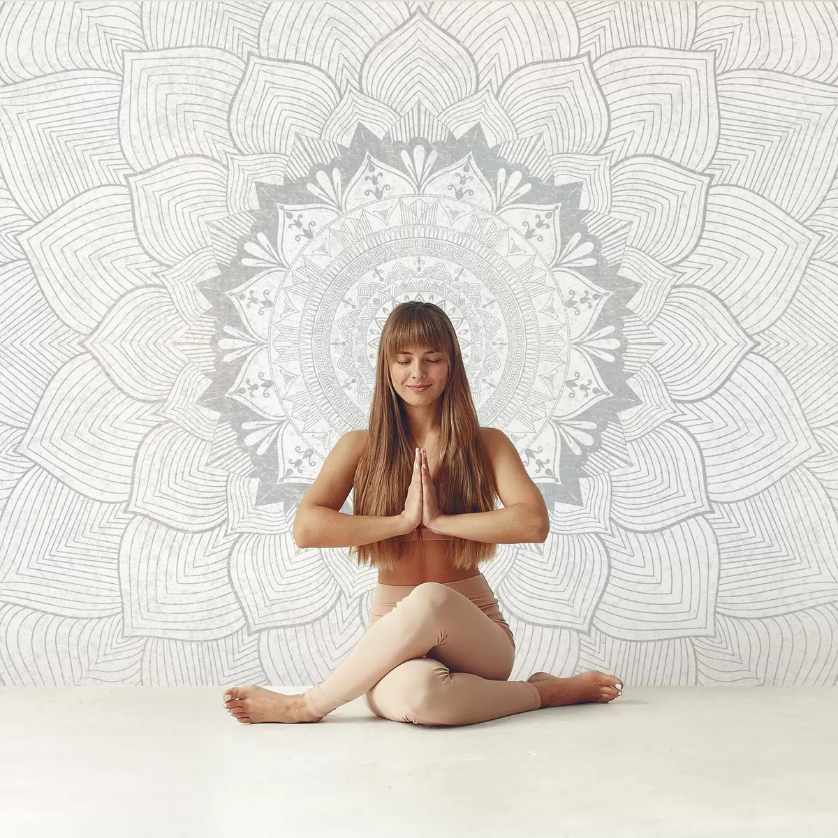 Fotobehang Ronde mandala, behang voor yogaruimte of om persoonlijke ruimte te harmoniseren. Muurmandala in grijstinten op een heterogene achtergrond met structuur N° w01088v2