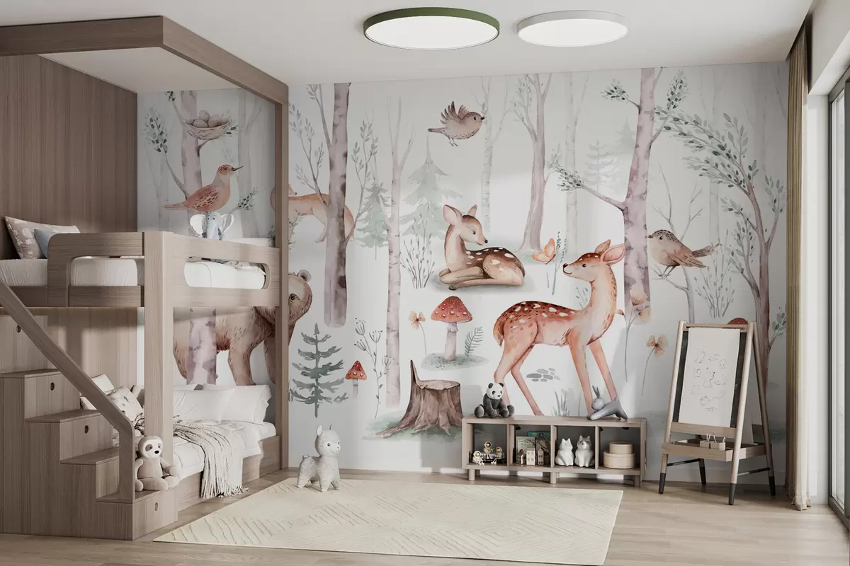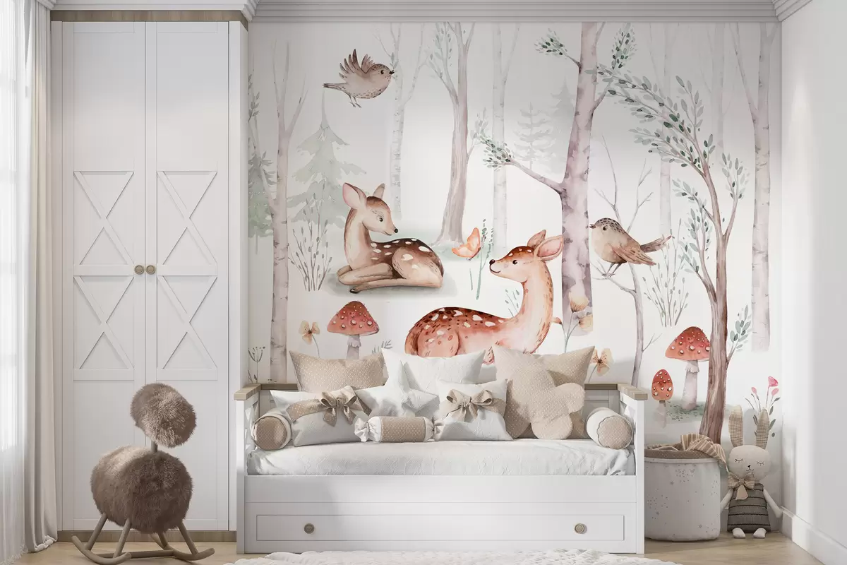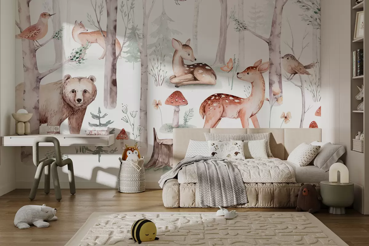 Fotobehang Behang voor de kinderkamer, bosdieren. Delicaat behang in aquarelstijl in aangename warme pastelkleuren op een witte achtergrond N° w01089