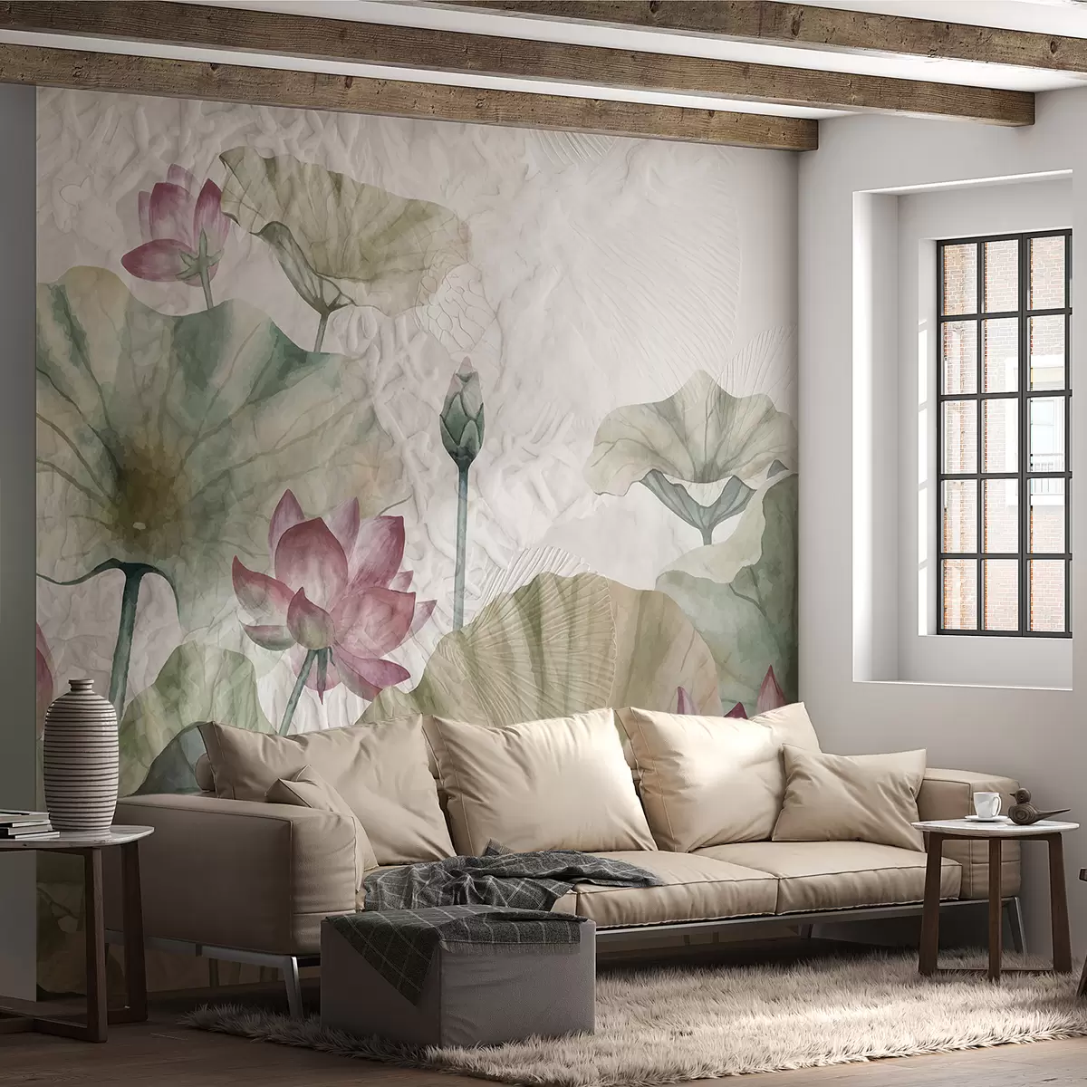Fotobehang Roze lotusbloemen met groene bladeren tegen een licht gestructureerde achtergrond N° w01248