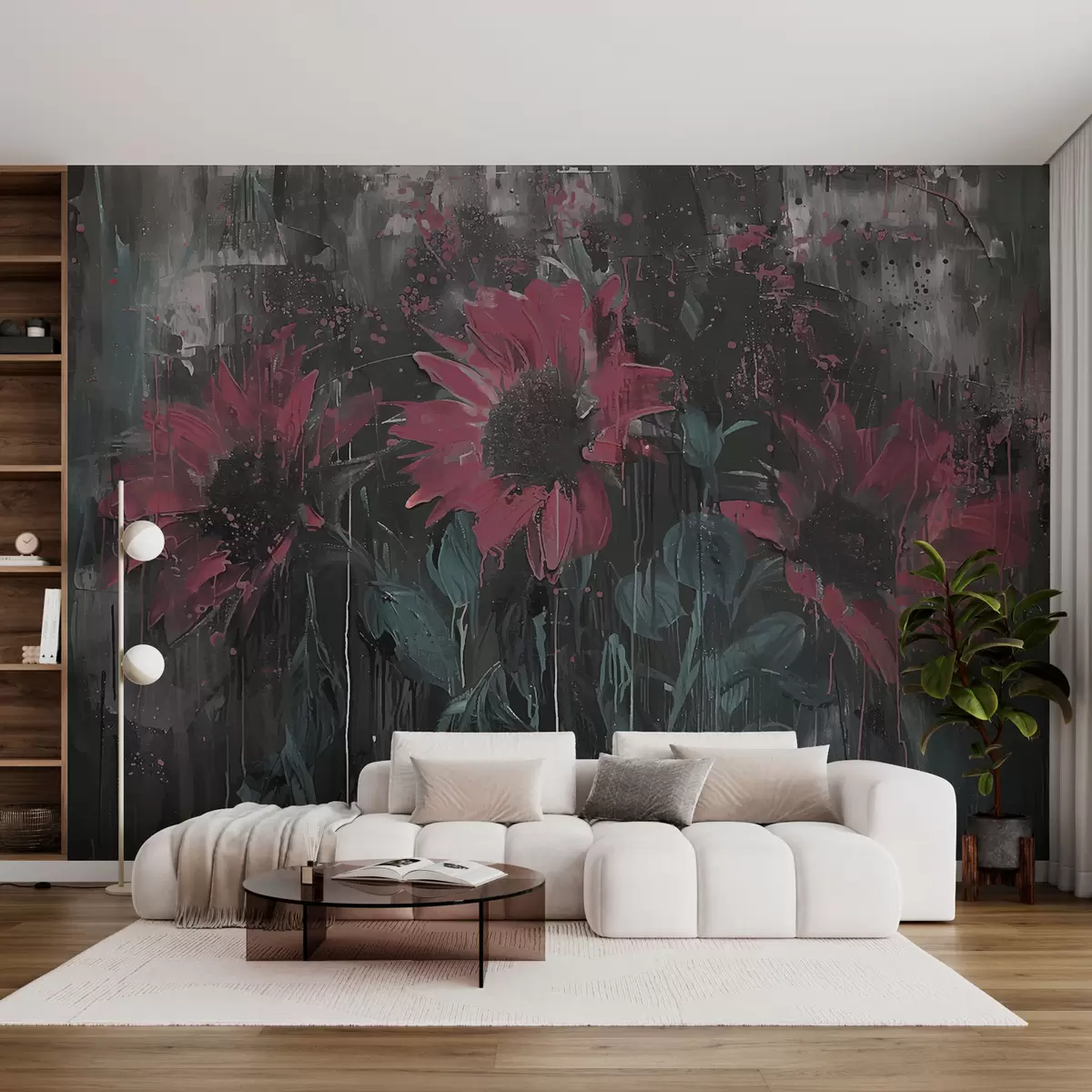 Fotobehang Abstracte zonnebloemafbeelding, donkergrijze achtergrond en roodroze tinten N° w01480v1