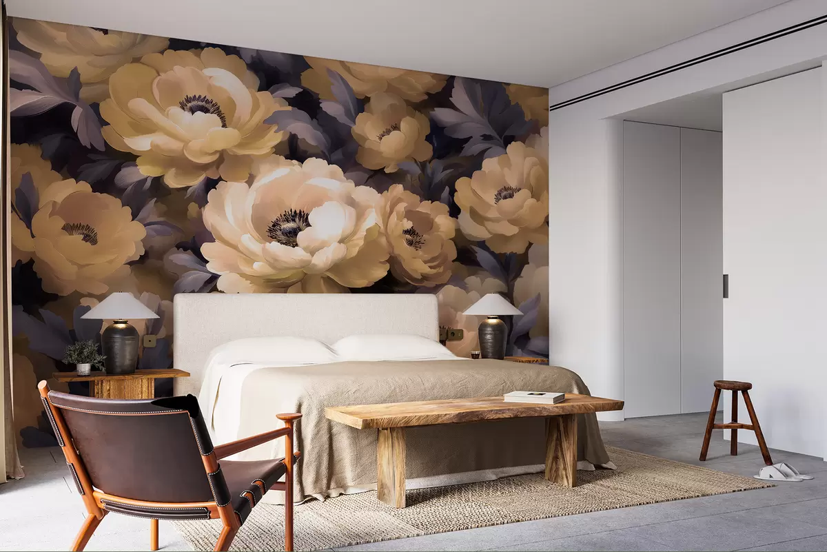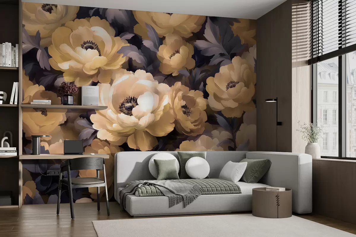Fotobehang Florale olieverfschilderijstijl gebaseerd op beige en paarse kleuren N° w01581