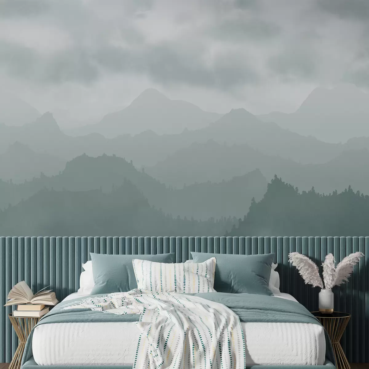 Fotobehang Mistige bergen met cirrus blauwe wolken in de lucht N° w01637v2